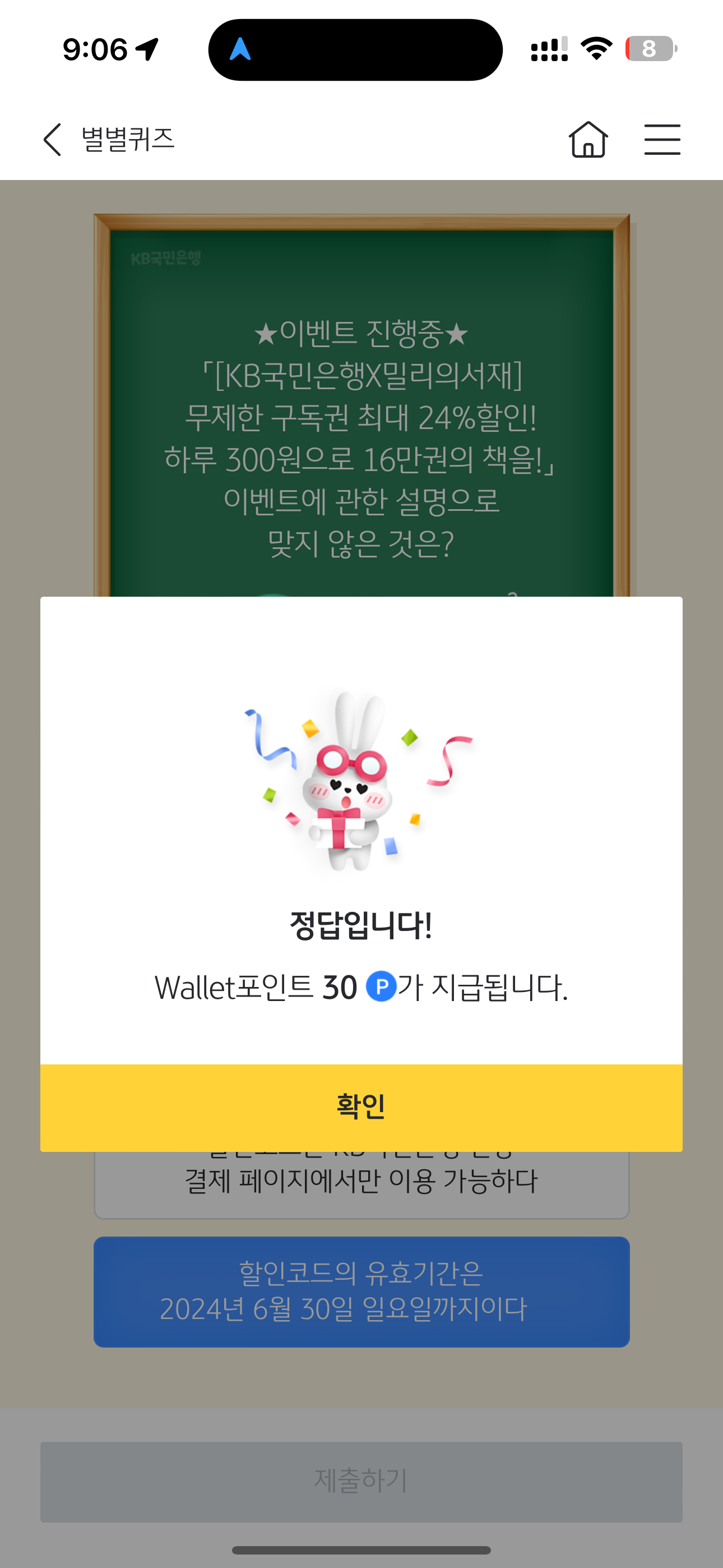 ★이벤트 진행중★ 「[KB국민은행X밀리의서재] 무제한 구독권 최대 24%할인! 하루 300원으로 16만권의 책을!」 이벤트에 관한 설명으로 맞지 않은 것은? 보기는 1. 밀리의 서재 구독권을 최대 24% 할인받을 수 있다 2. '할인코드 받기'를 누르면 밀리의 서재 무제한구독권 할인코드가 지급된다 3. 할인코드는 KB국민은행 전용 결제 페이지에서만 이용 가능하다 4. 할인코드의 유효기간은 2024년 6월 30일 일요일까지이다