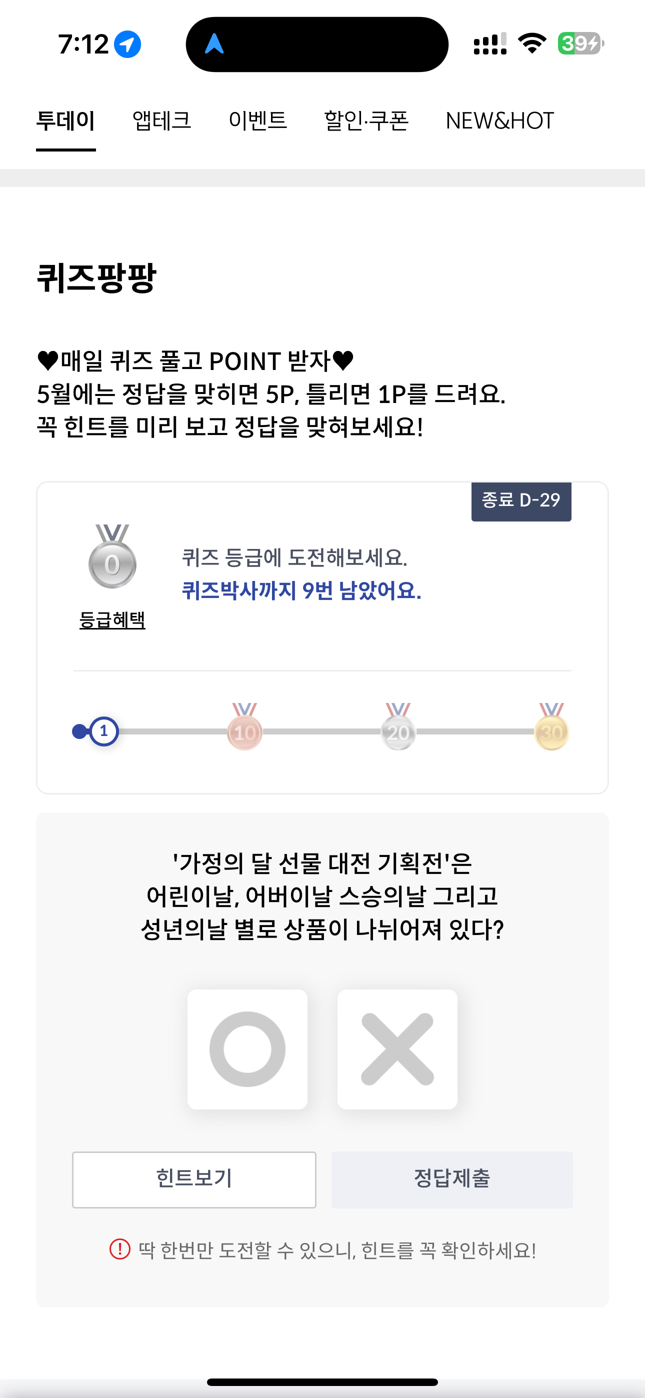 '가정의 달 선물 대전 기획전'은 어린이날, 어버이날 스승의 날 그리고 성년의날 별로 상품이 나뉘어져 있다? O, X 퀴즈인데요. 이제 가정의 달로 선물을 많이 고민하실텐데요. 이런 기획전을 잘 활용하면 꽤 좋은 가격에 선물을 선택할 수 있으니 참고해 두세요