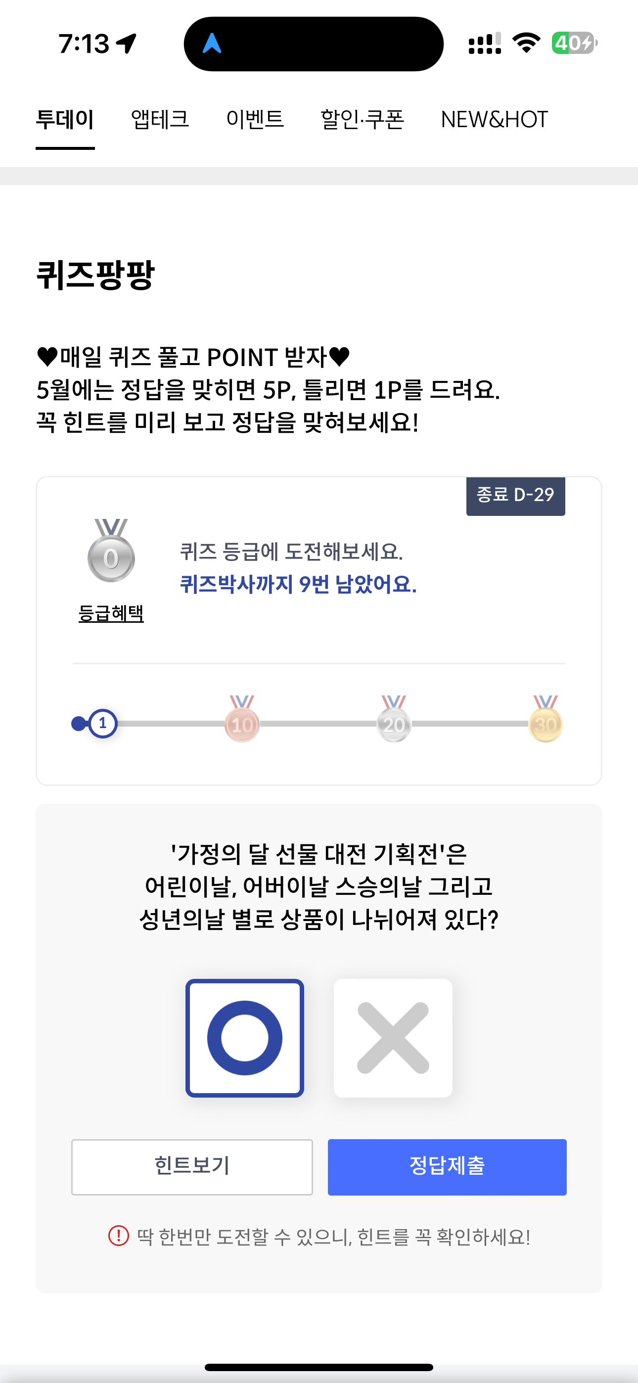 '가정의 달 선물 대전 기획전'은 어린이날, 어버이날 스승의 날 그리고 성년의날 별로 상품이 나뉘어져 있다? O, X 퀴즈인데요. 이제 가정의 달로 선물을 많이 고민하실텐데요. 이런 기획전을 잘 활용하면 꽤 좋은 가격에 선물을 선택할 수 있으니 참고해 두세요