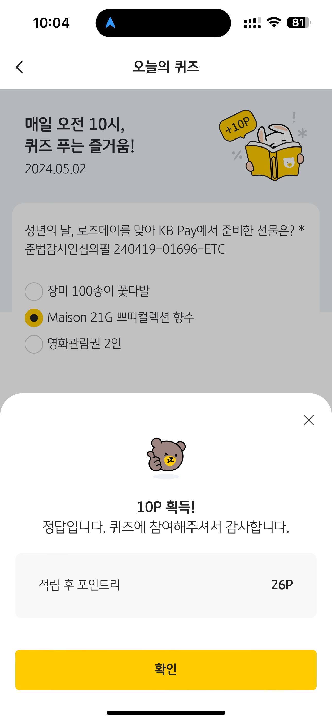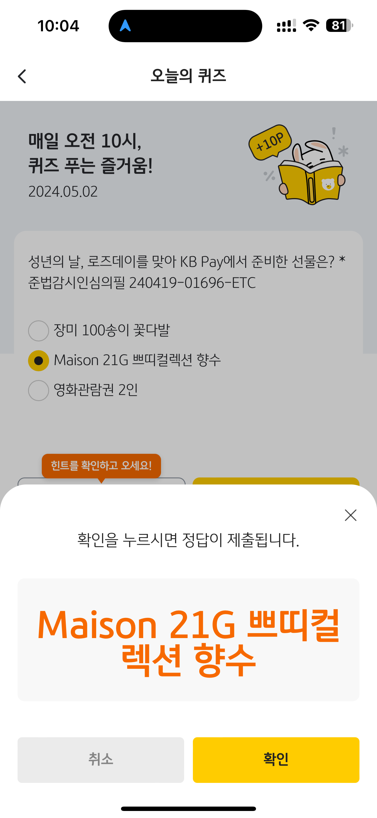 KB Pay 오늘의 퀴즈 정답은 Maison 21G 쁘띠컬렉션 향수 입니다
