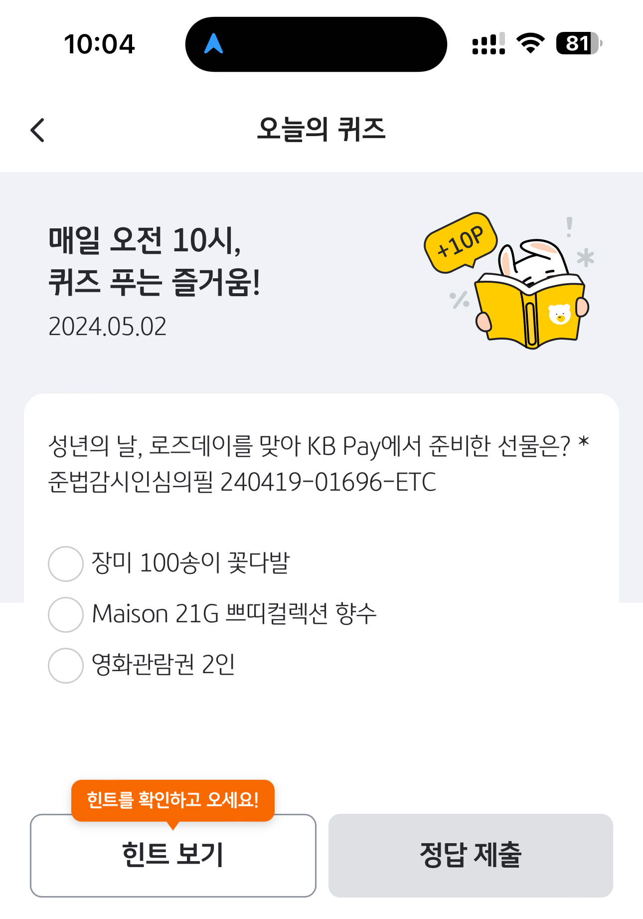 KB Pay 오늘의 퀴즈 5월 2일 문제입니다
