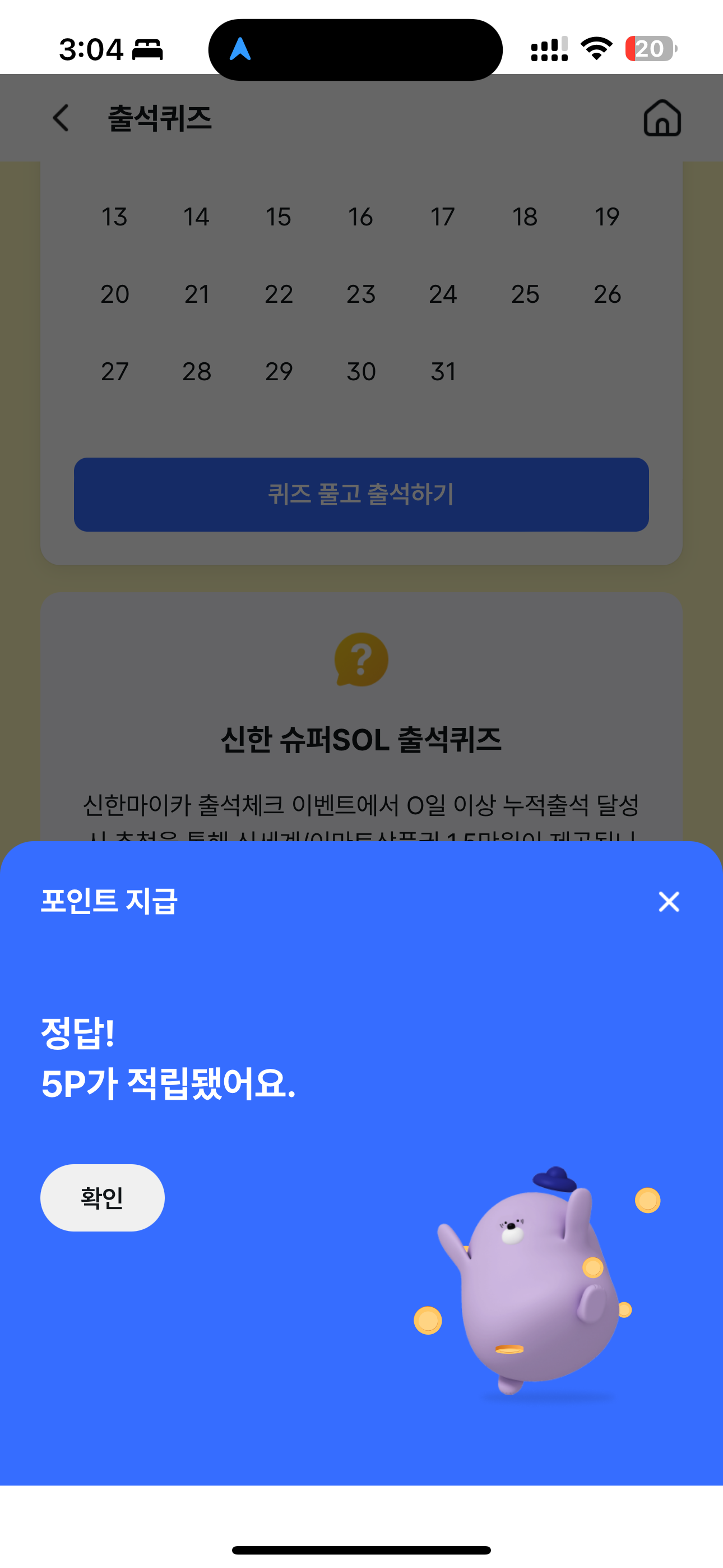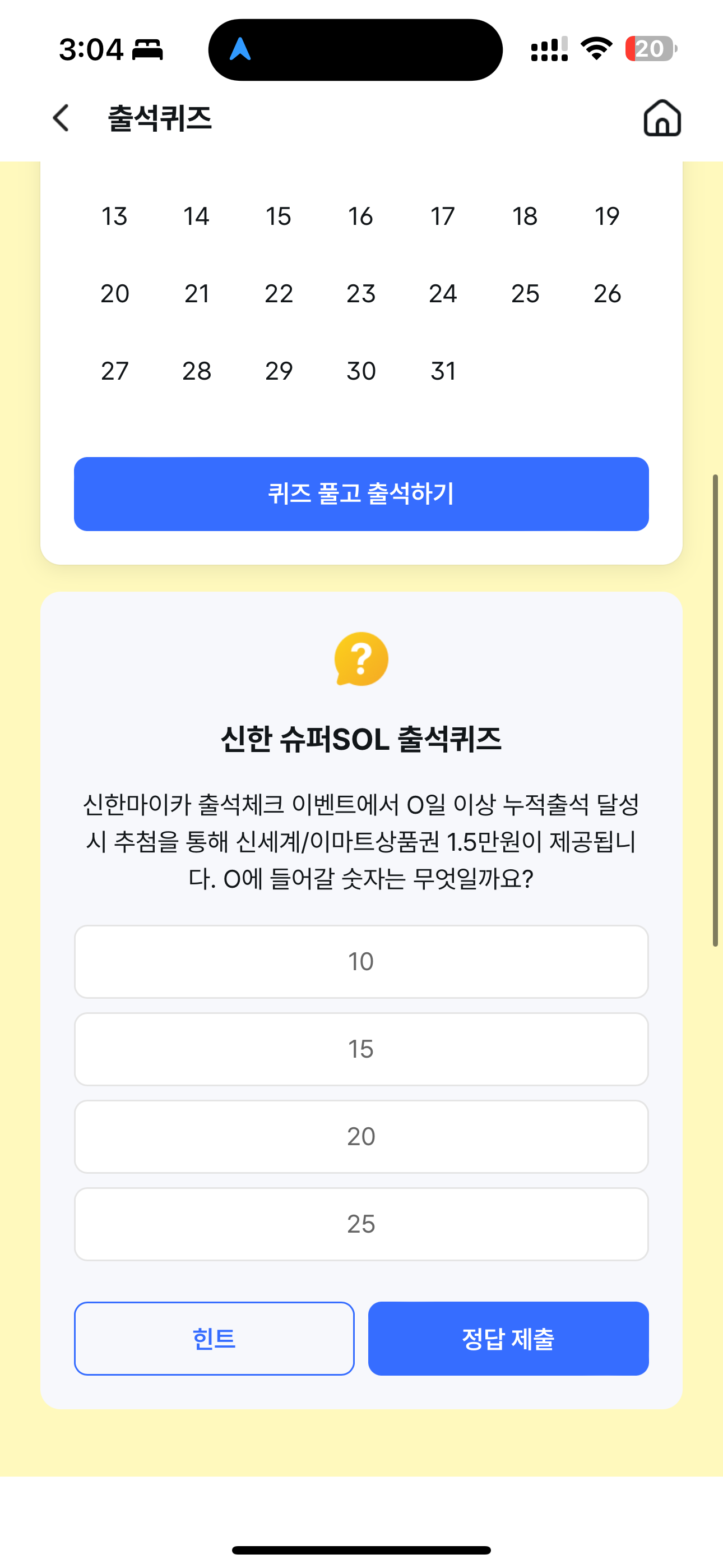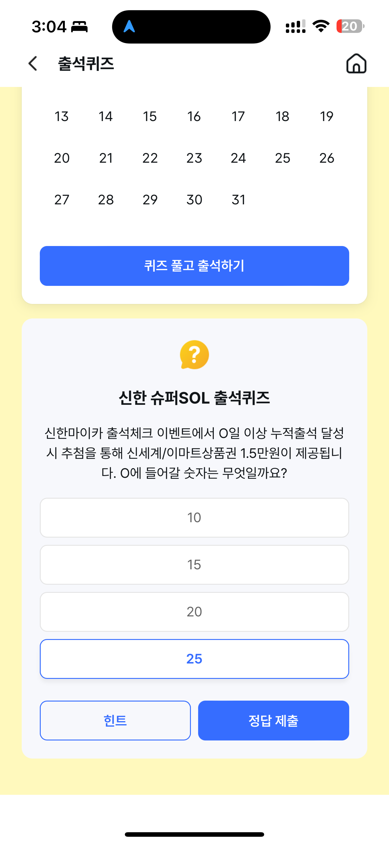 신한 슈퍼SOL 출석퀴즈 정답은 25 입니다