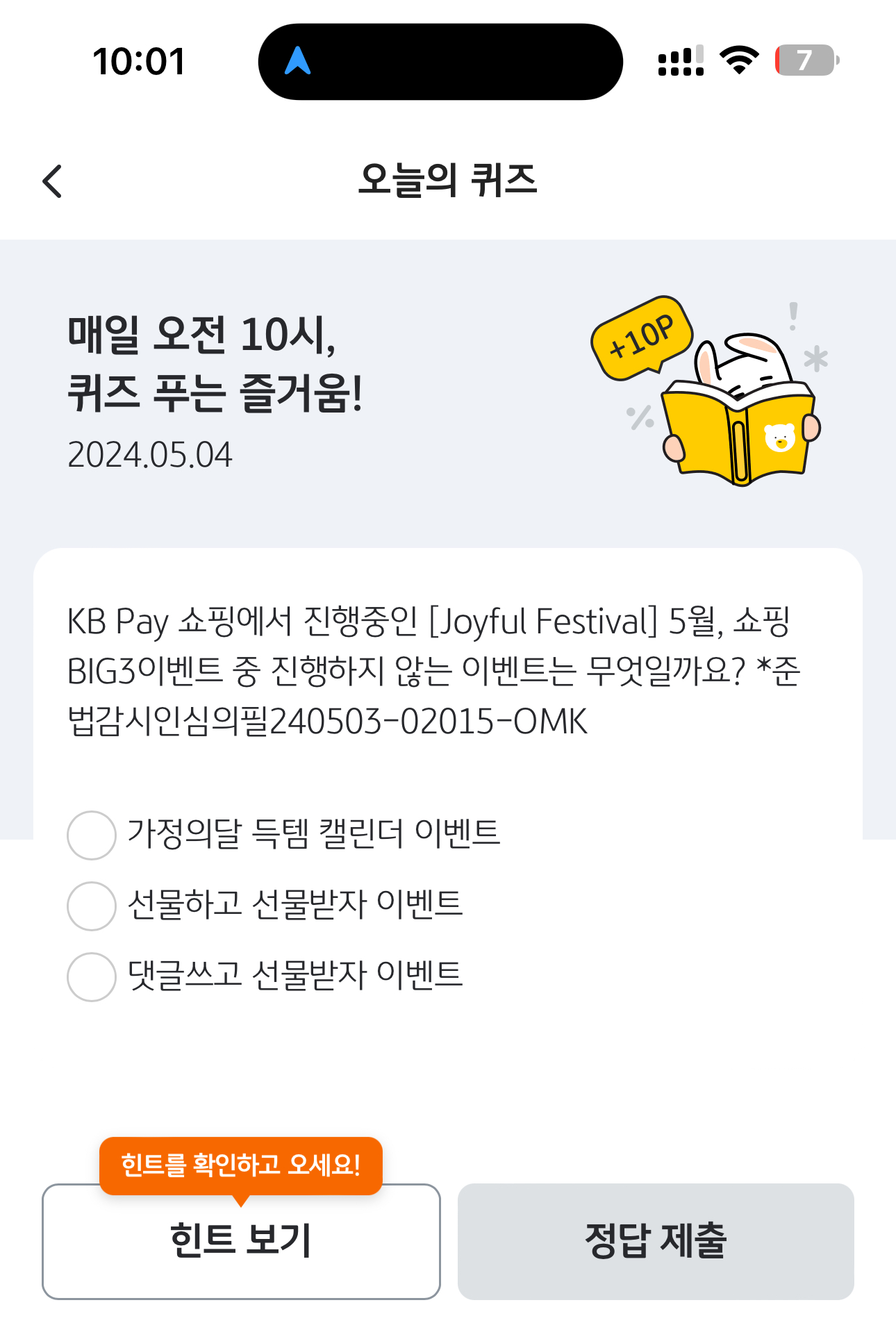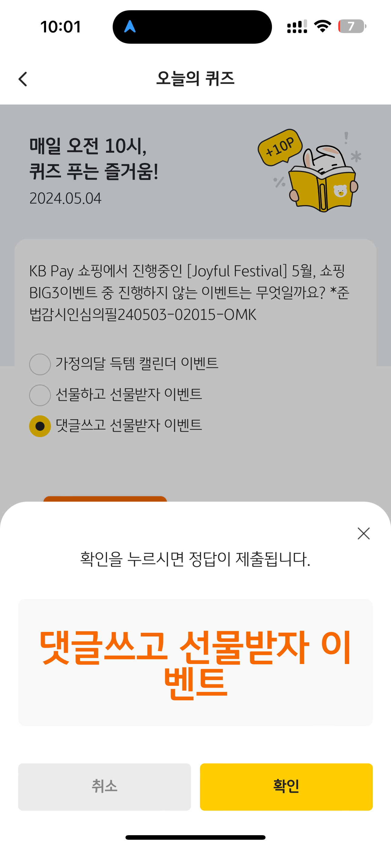 KB Pay 오늘의 퀴즈 정답은 댓글쓰고 선물받자 이벤트 입니다