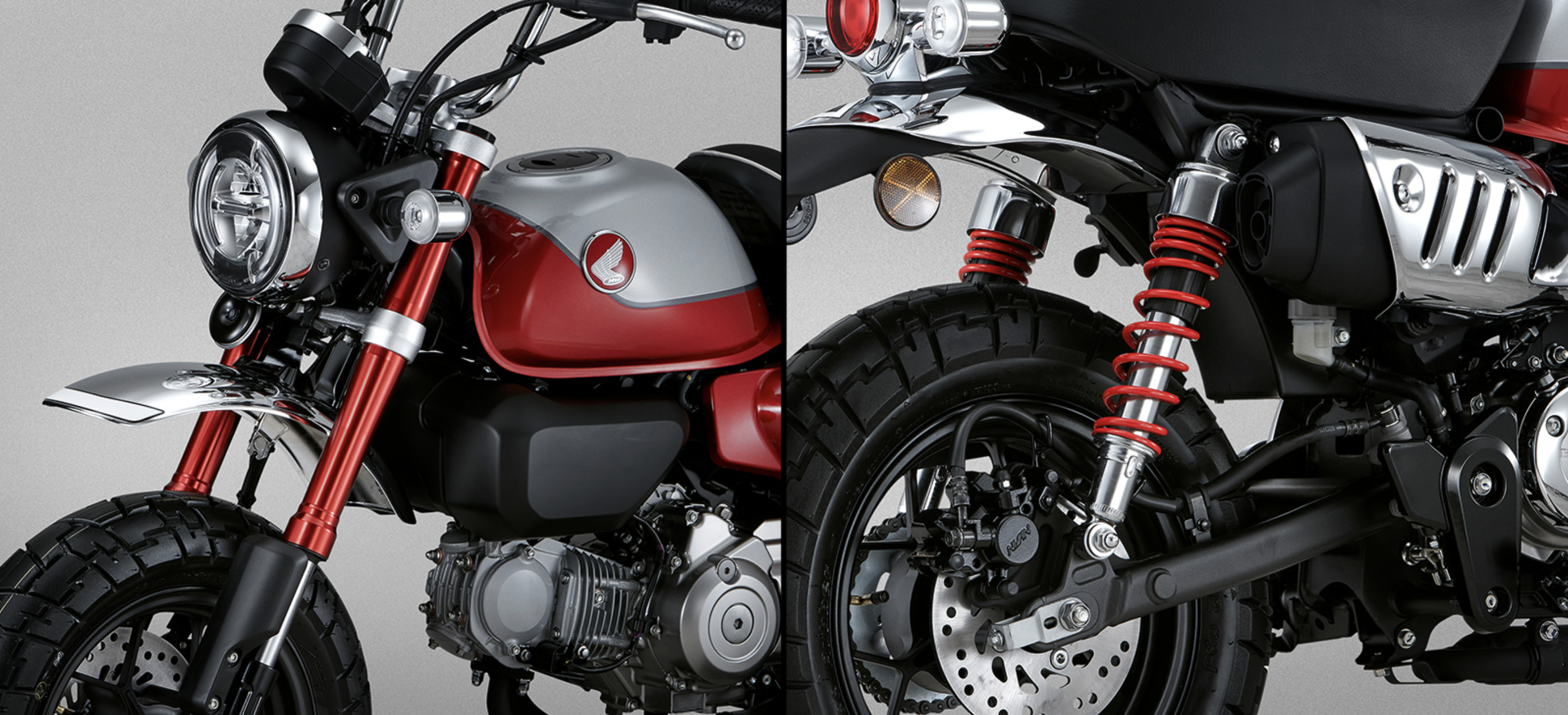 2024년 혼다 몽키125는 부드러운 승차감을 위해 도립식 프런트 서스펜션과 트윈 리어 서스펜션이 적용되어 있습니다. 다양한 도로 환경에도 부드러운 승차감을 느낄 수 있게 해주는 포인트입니다.