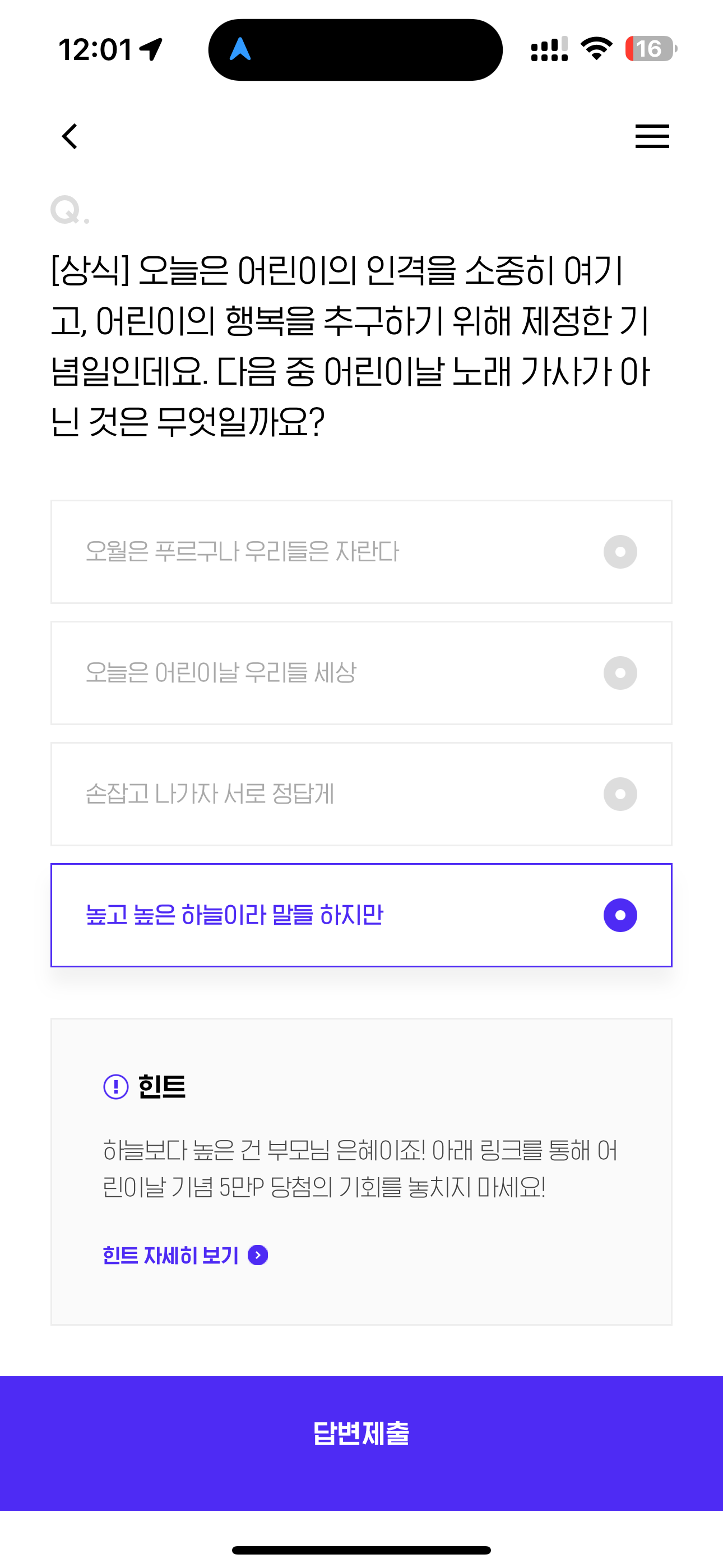 H포인트 퀴즈 정답은 높고 높은 하늘이라 말들 하지만 입니다