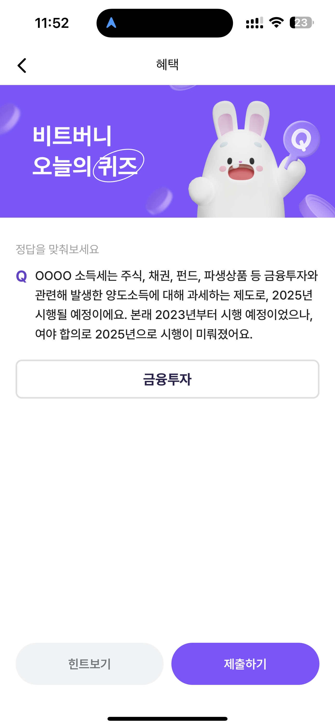 비트버니 오늘의 퀴즈 정답은 금융투자 입니다