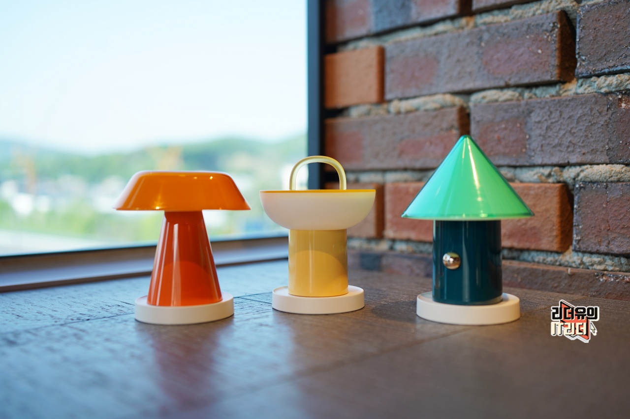 3가지 디자인의 루메나 SPACE S 무드등 입니다. 파인 그린 색상의 CONE, 카나리 옐로우 색상의 POT, 선 오렌지 색상의 ROOF 입니다.