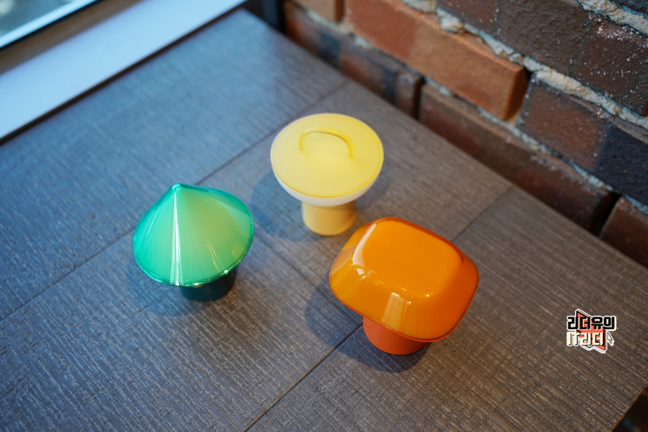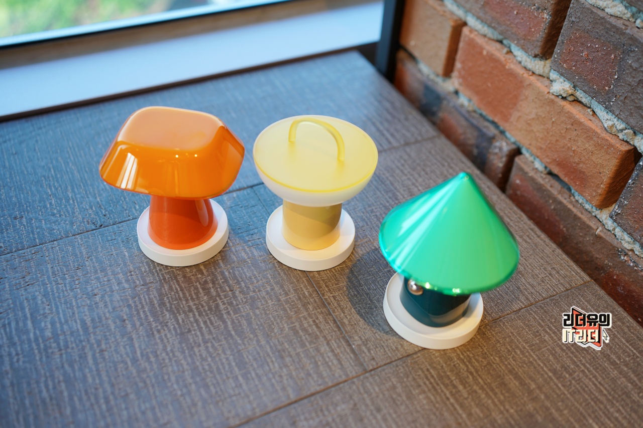 3가지 디자인의 루메나 SPACE S 무드등 입니다. 파인 그린 색상의 CONE, 카나리 옐로우 색상의 POT, 선 오렌지 색상의 ROOF 입니다.