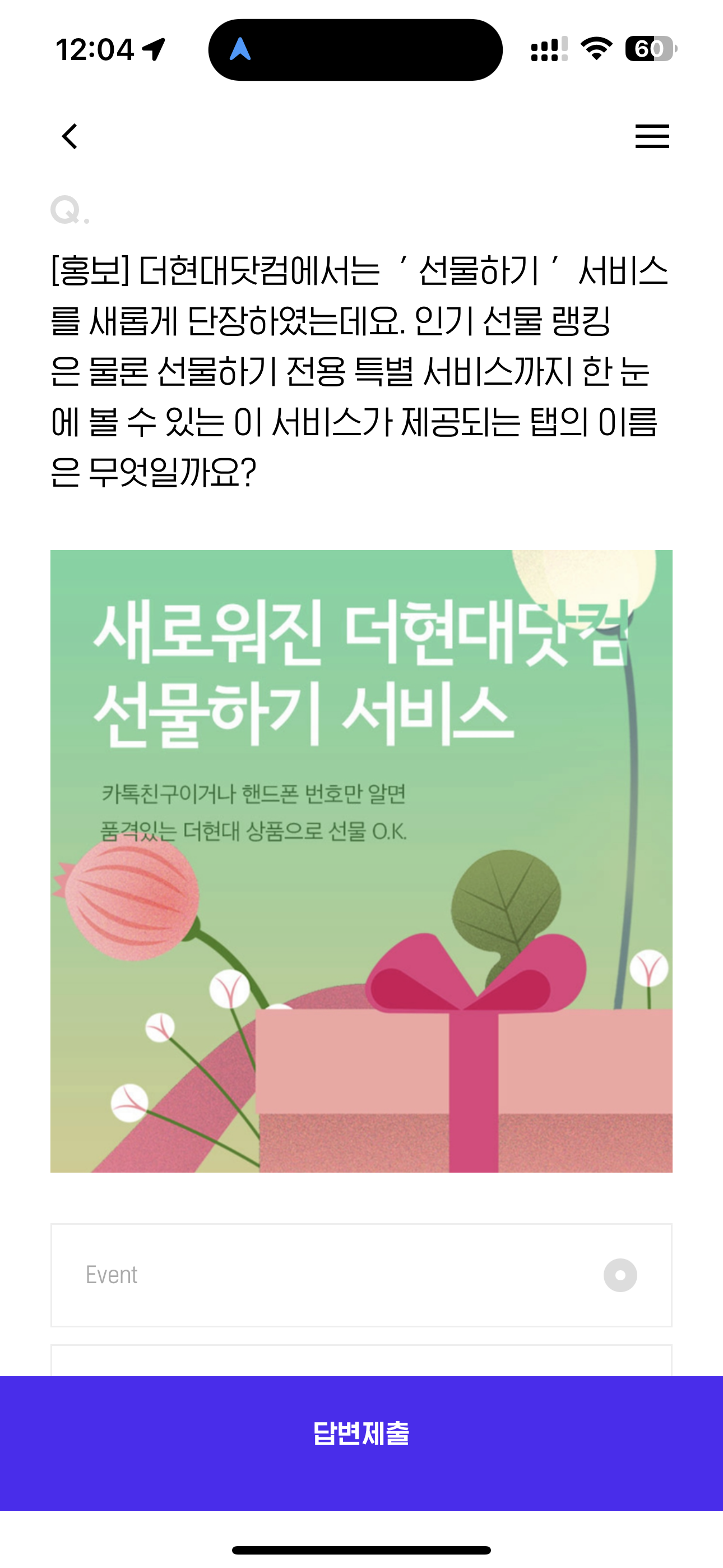 [홍보] 더현대닷컴에서는 ' 선물하기 ' 서비스를 새롭게 단장하였는데요. 인기 선물 랭킹은 물론 선물하기 전용 특별 서비스까지 한 눈에 볼 수 있는 이 서비스가 제공되는 탭의 이름은 무엇일까요? 보기는 1. Event 2. Gift 3. Re.Green 4. Show 입니다.
