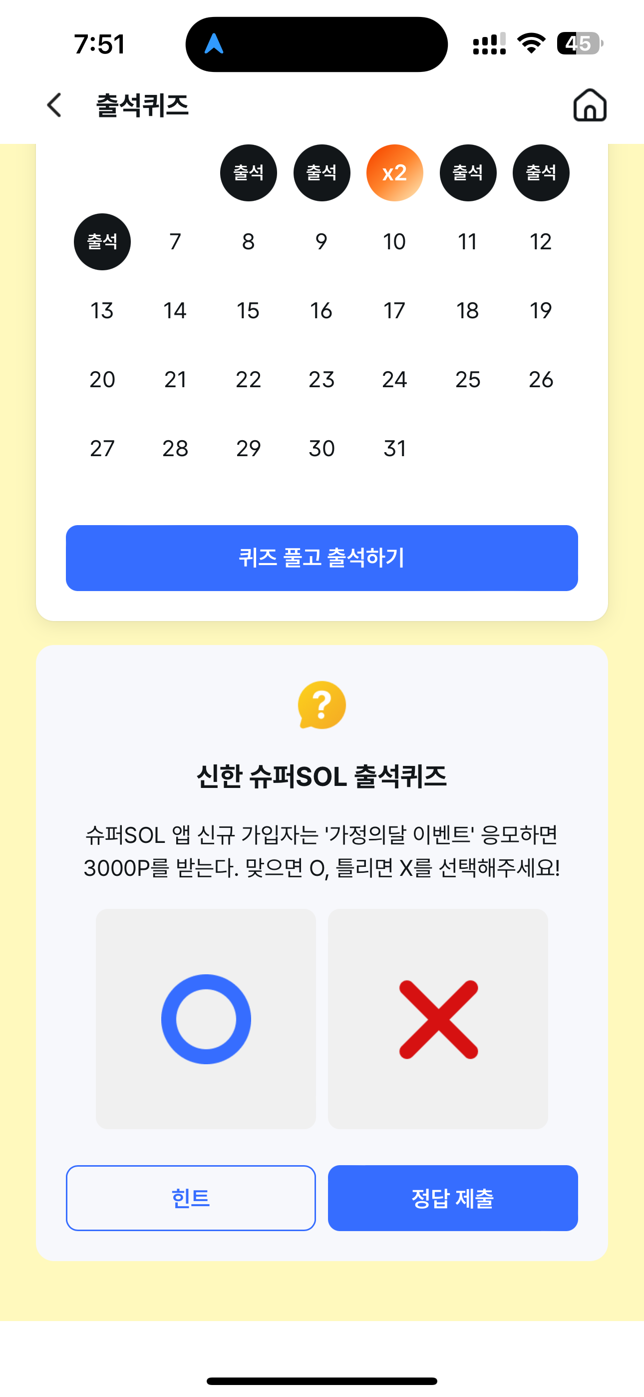 신한 슈퍼SOL 출석퀴즈 정답은 O 입니다