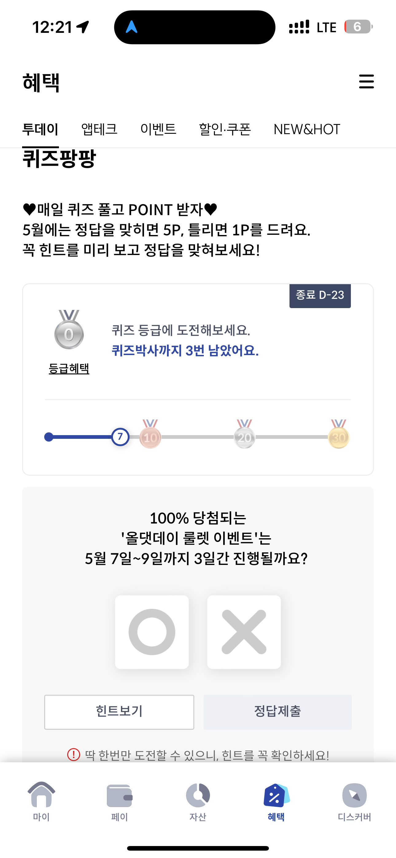 100% 당첨되는 '올댓데이 룰렛 이벤트'는 5월 7일~9일까지 3일간 진행될까요? O, X 퀴즈인데요. 올댓데이 룰렛 이벤트는 100% 당첨이 되는 이벤트입니다. 가정의 달을 맞아 좋은 이벤트들이 많으니 잘 참고해서 놓치지 마세요. 여러분의 행운을 응원합니다