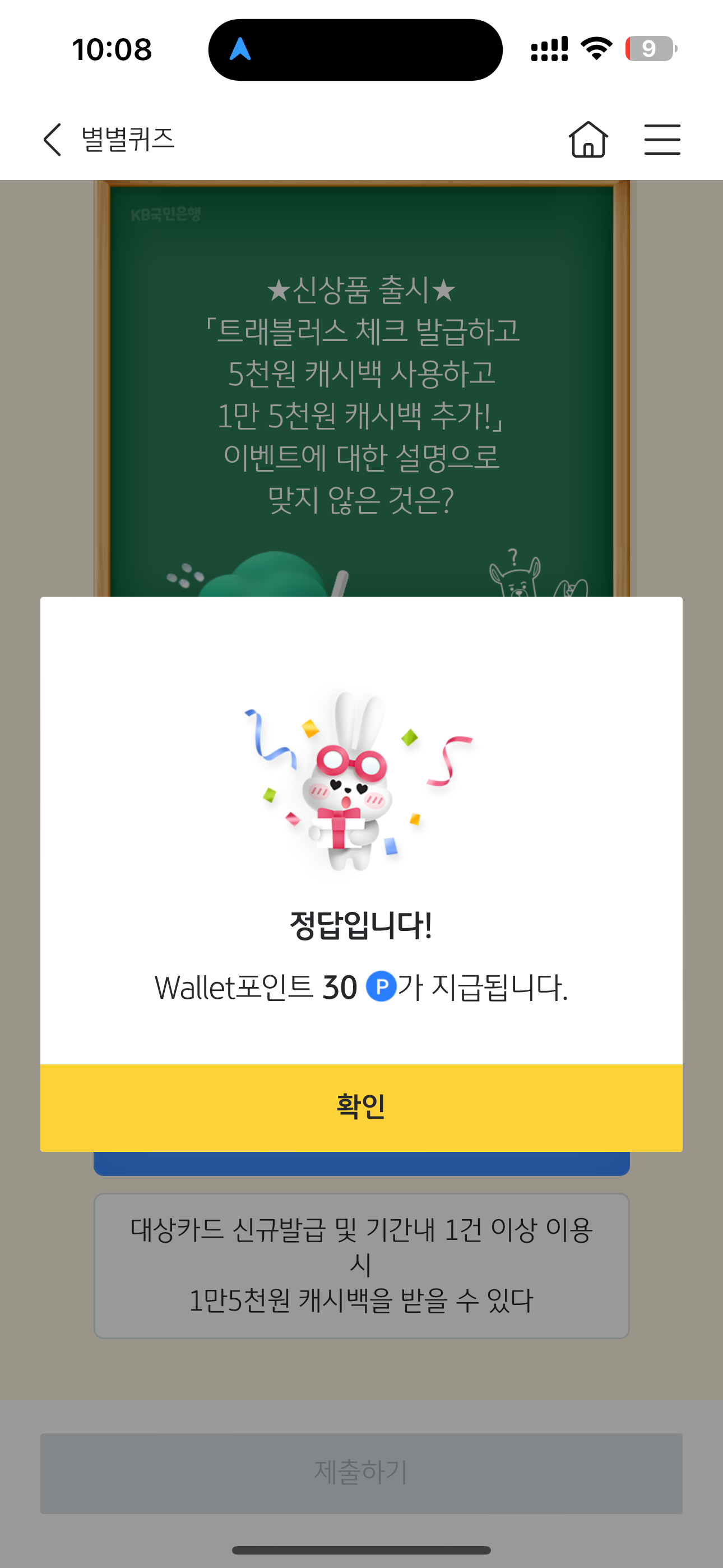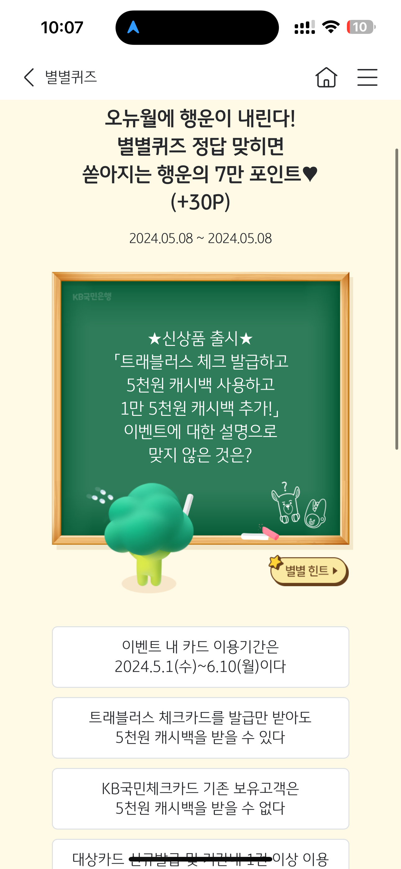KB스타뱅킹 별별퀴즈 정답은 KB국민체크카드 기존 보유고객은 5천원 캐시백을 받을 수 없다 입니다