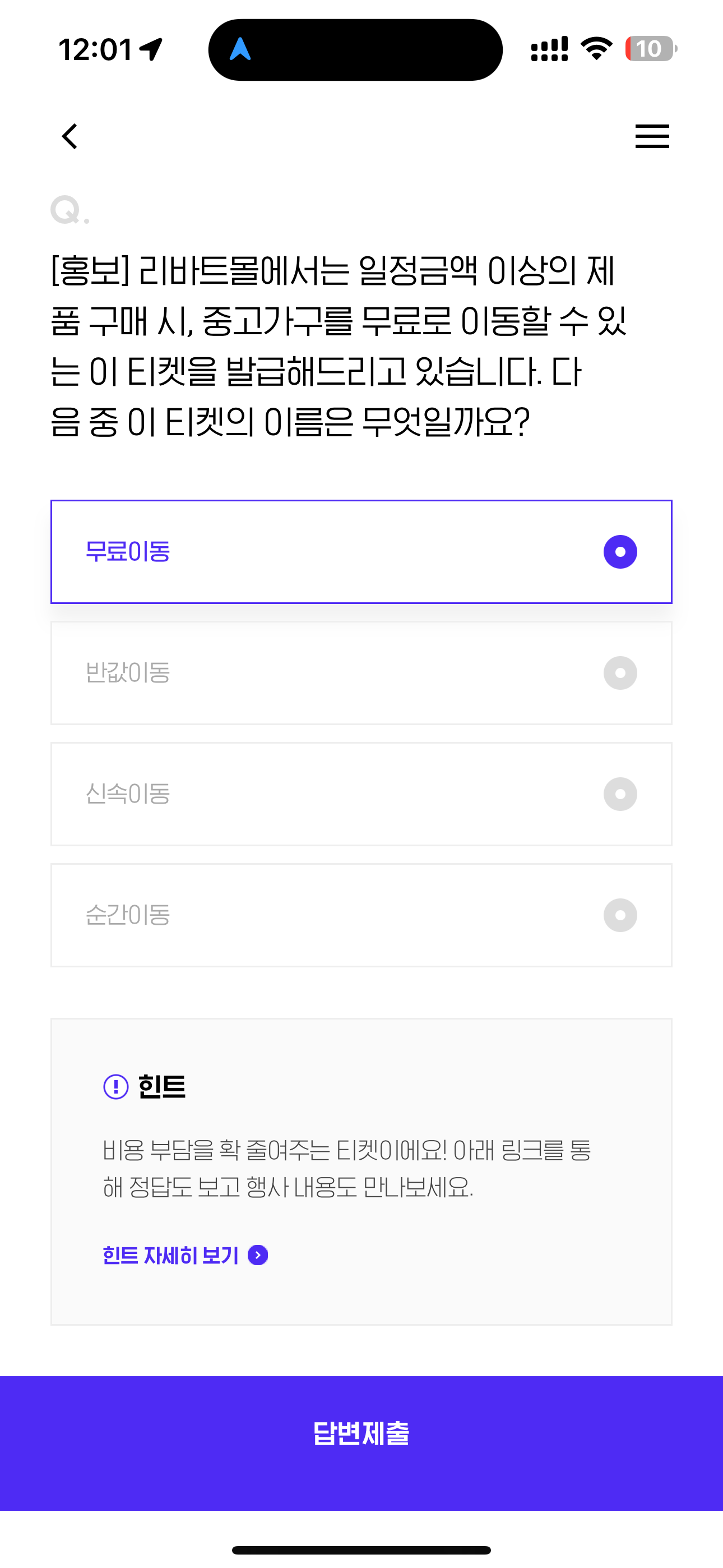 [홍보] 리바트몰에서는 일정금액 이상의 제품 구매 시, 중고가구를 무료로 이동할 수 있는 이 티켓을 발급해드리고 있습니다. 다음 중 이 티켓의 이름은 무엇일까요? 보기는 1. 무료이동 2. 반값이동 3. 신속이동 4. 순간이동 입니다. 중고가구를 무료로 이동할 수 있다는데 힌트가 있습니다.