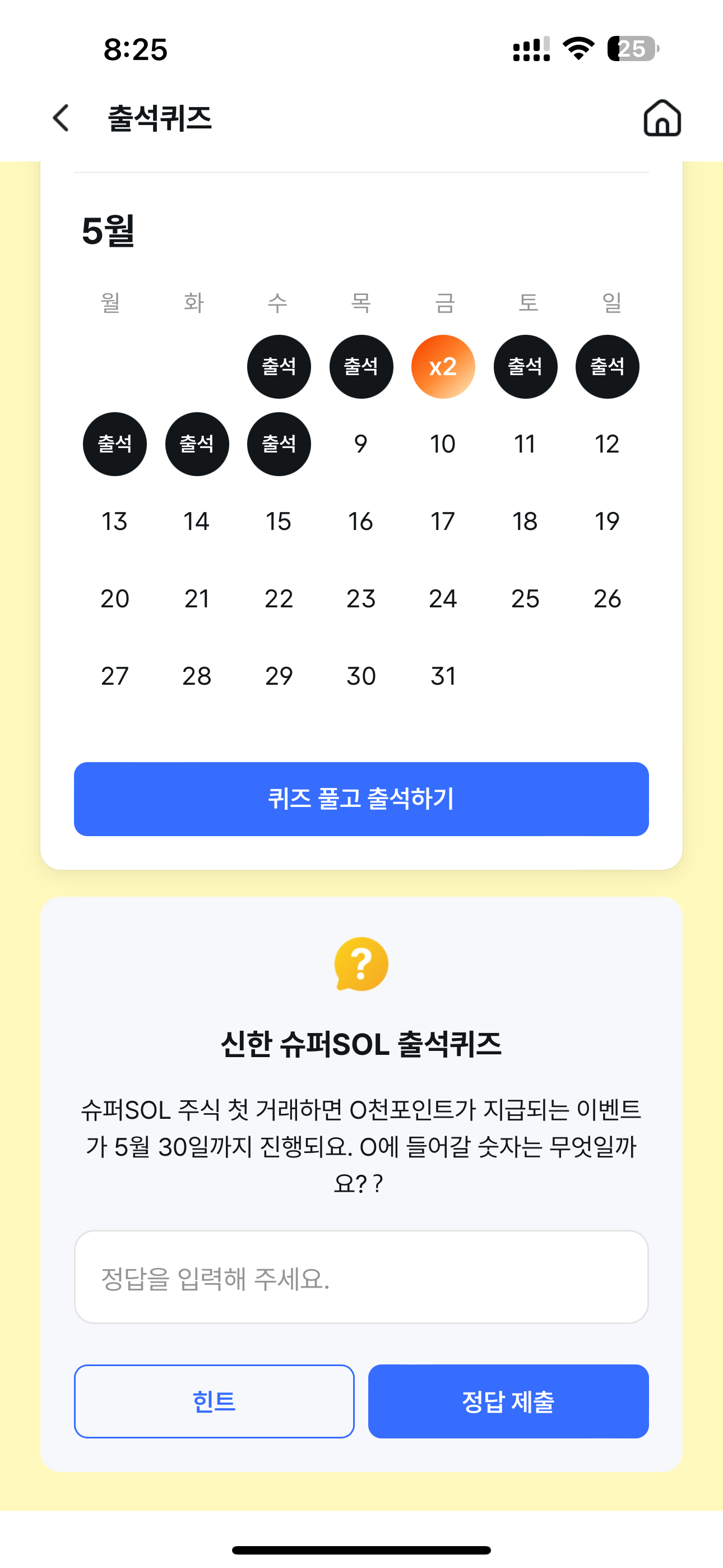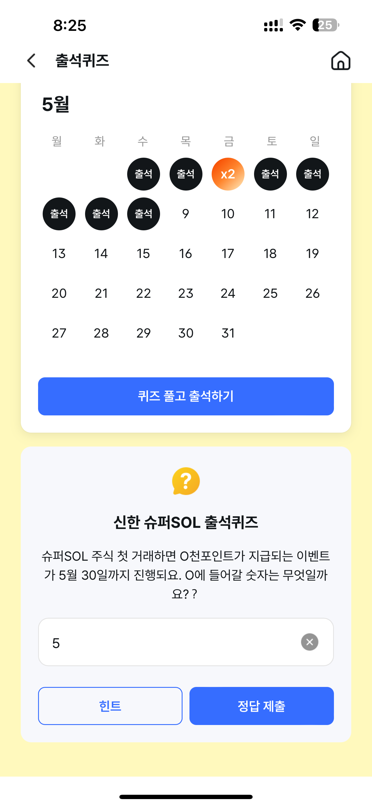 신한 슈퍼SOL 출석퀴즈 정답은 5 입니다