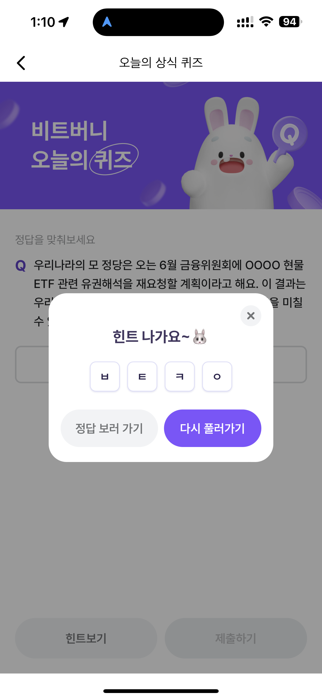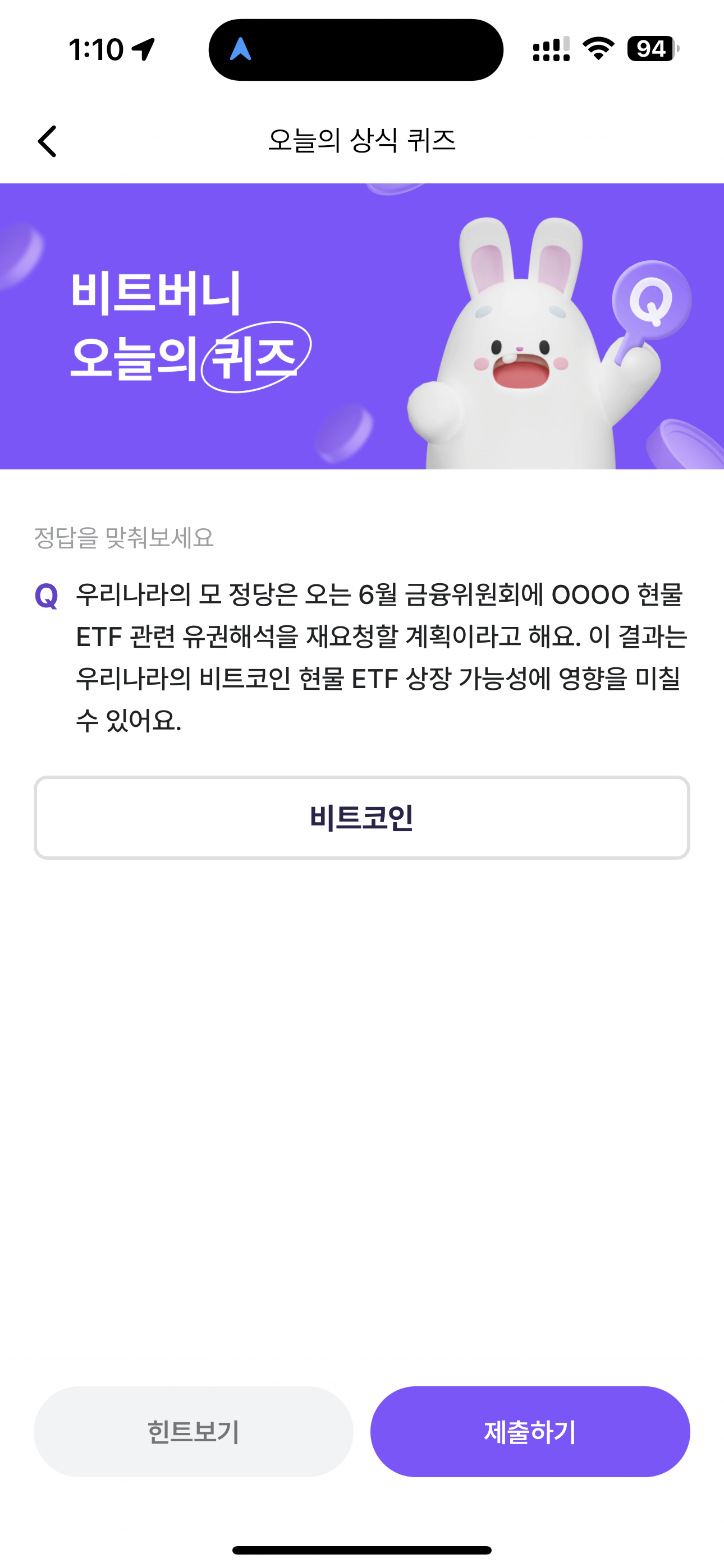 비트버니 오늘의 퀴즈 5월 10일 ㅂㅌㅋㅇ 정답(우리나라의 모 정당은 오는 6월 금융위원회에 OOOO 현물 ETF 관련 유권해석을 재요청할 계획이라고 해요)