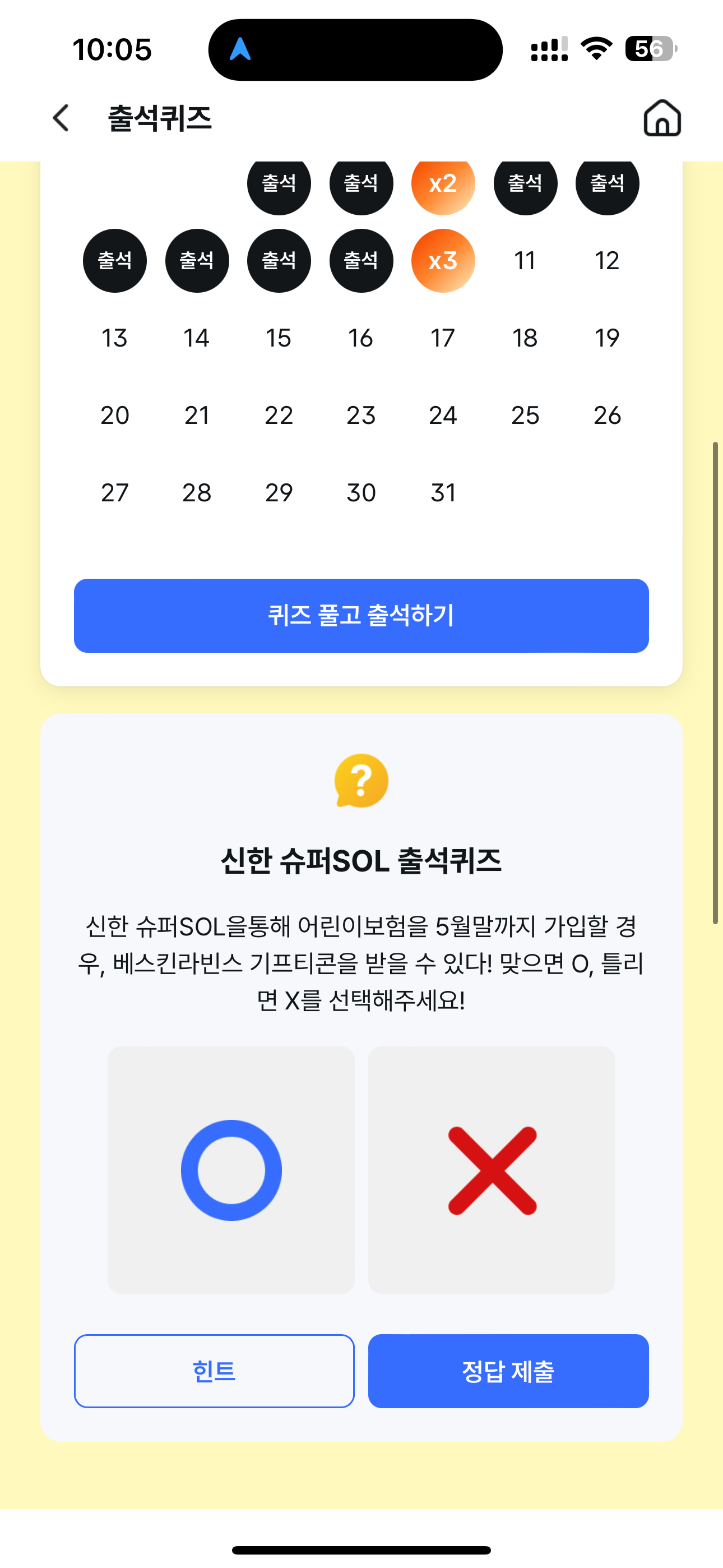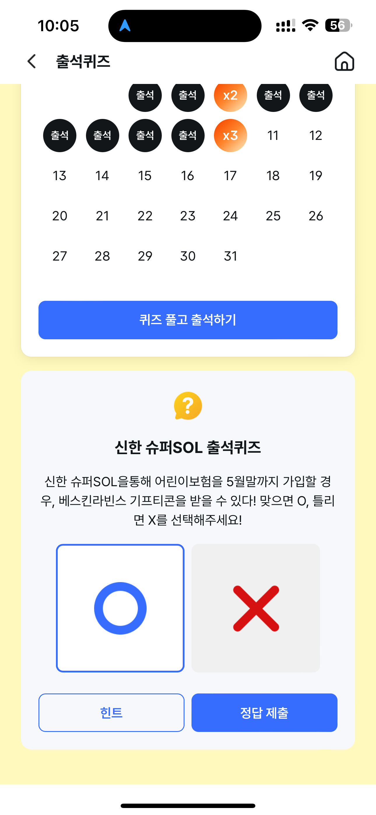 신한 슈퍼SOL 출석퀴즈 정답은 O 입니다