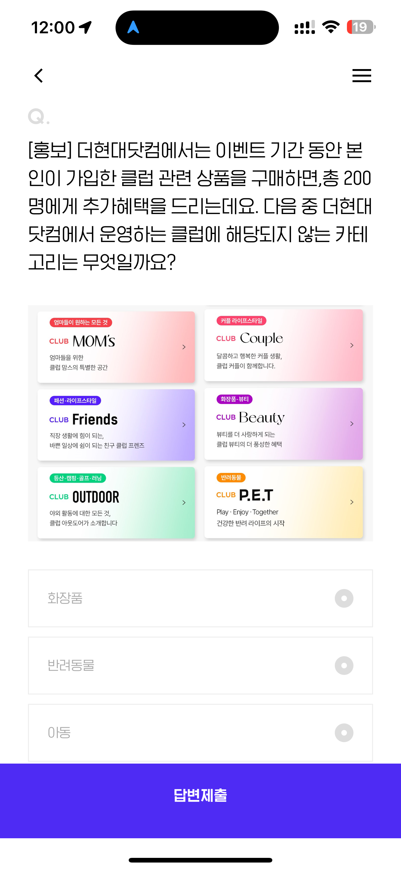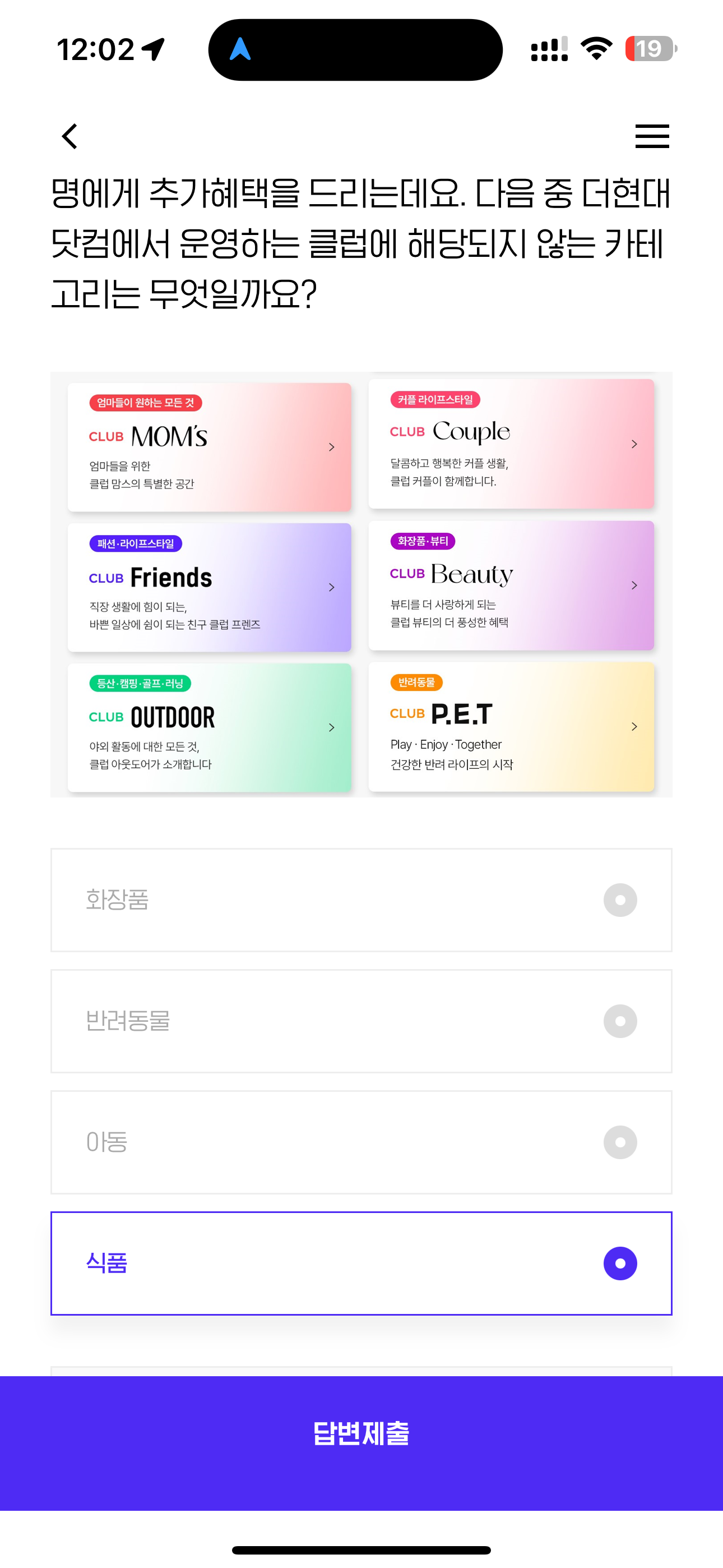 [홍보] 더현대닷컴에서는 이벤트 기간 동안 본인이 가입한 클럽 관련 상품을 구매하면,총 200명에게 추가혜택을 드리는데요. 다음 중 더현대닷컴에서 운영하는 클럽에 해당되지 않는 카테고리는 무엇일까요? 보기는 1. 화장품 2. 반려동물 3. 아동 4. 식품 입니다