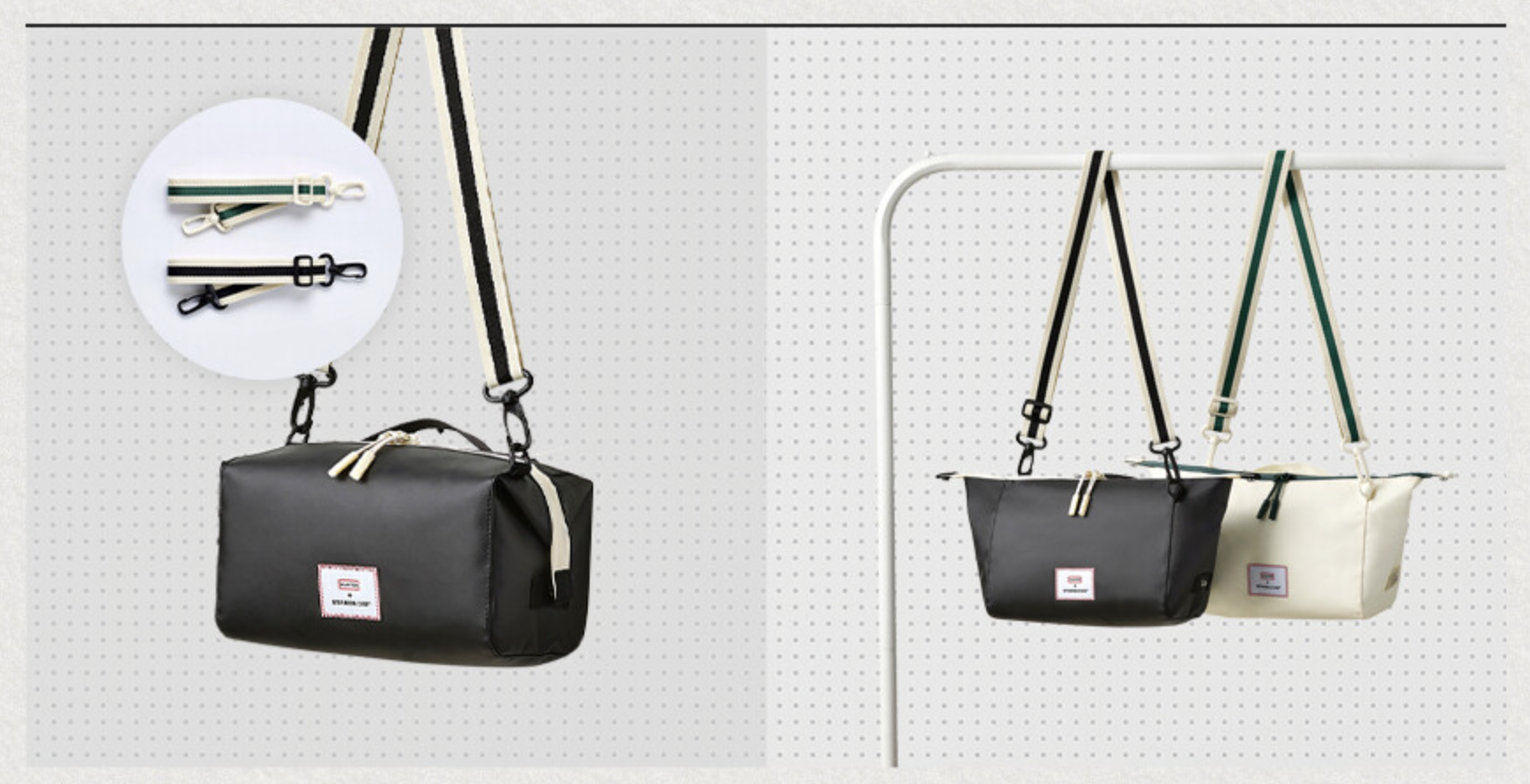 색상에 따라 스트랩 색상도 다른 센스있는 조합을 보여주고 있습니다. 패션 아이템으로 인기가 많을까요? 사이즈는 가로 21cm x 세로 11cm 폭 12cm 이고 재질은 폴리에스터 100% 입니다.