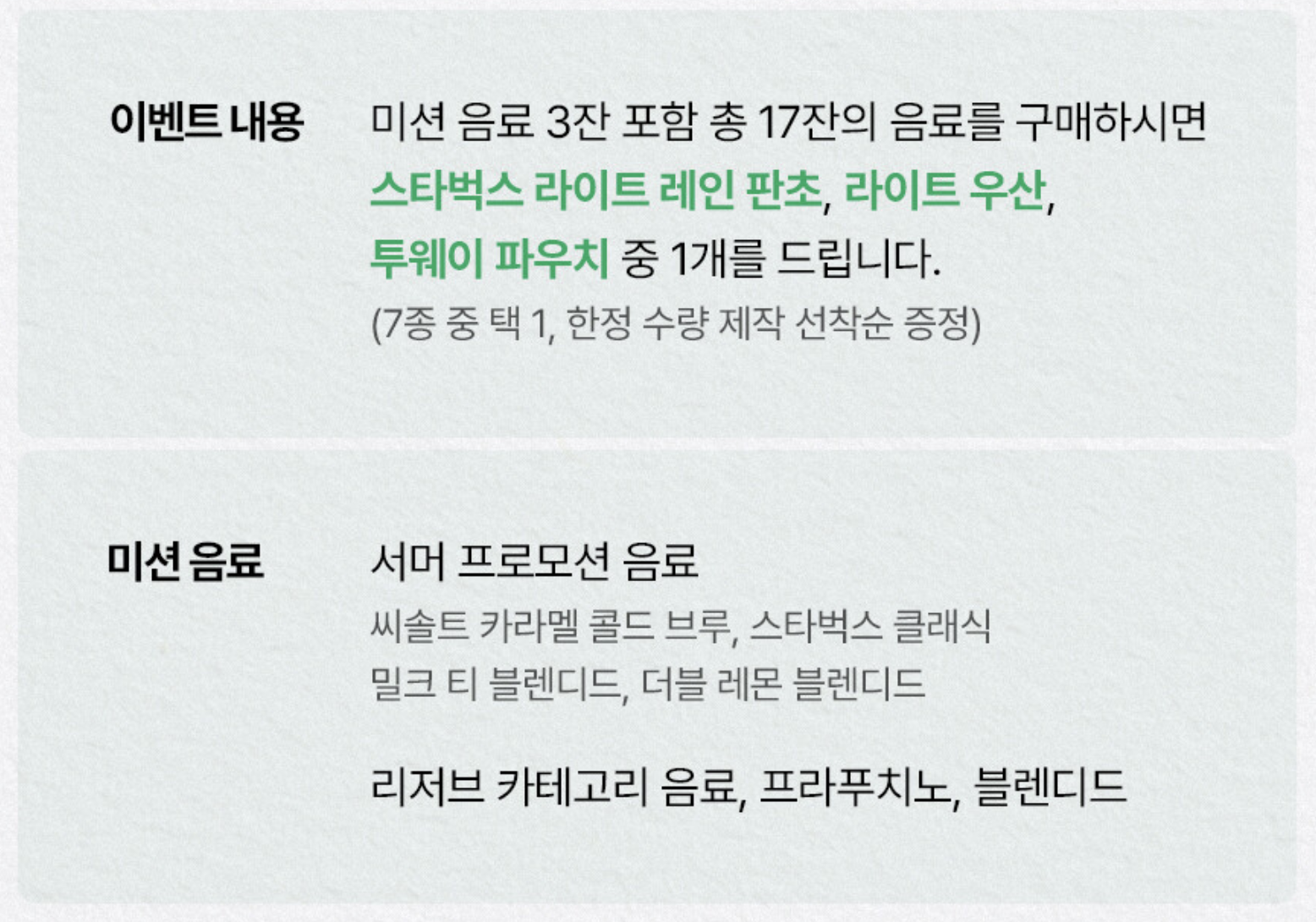 2024년 여름 스타벅스 프리퀀시 증정품 스타벅스 라이트 레인 판초, 라이트 우산, 투웨이 파우치 중 1개를 받게 되는데요. 한정 수량 제작되는 제품들이라 선착순으로 받을 수 있습니다. 즉, 빨리 하셔야 원하는 증정품을 받을 수 있습니다.