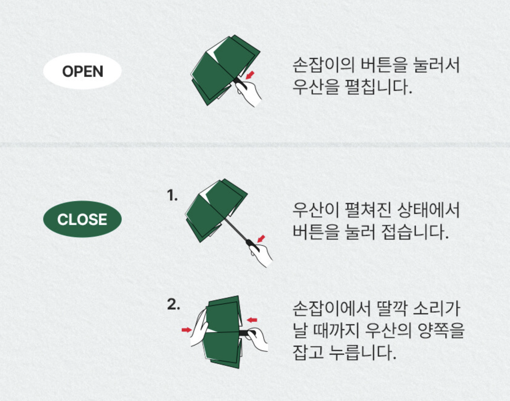폴딩 우산은 자동으로 준비되어 있습니다. 보통의 폴딩 우산과 똑같은 방식입니다.