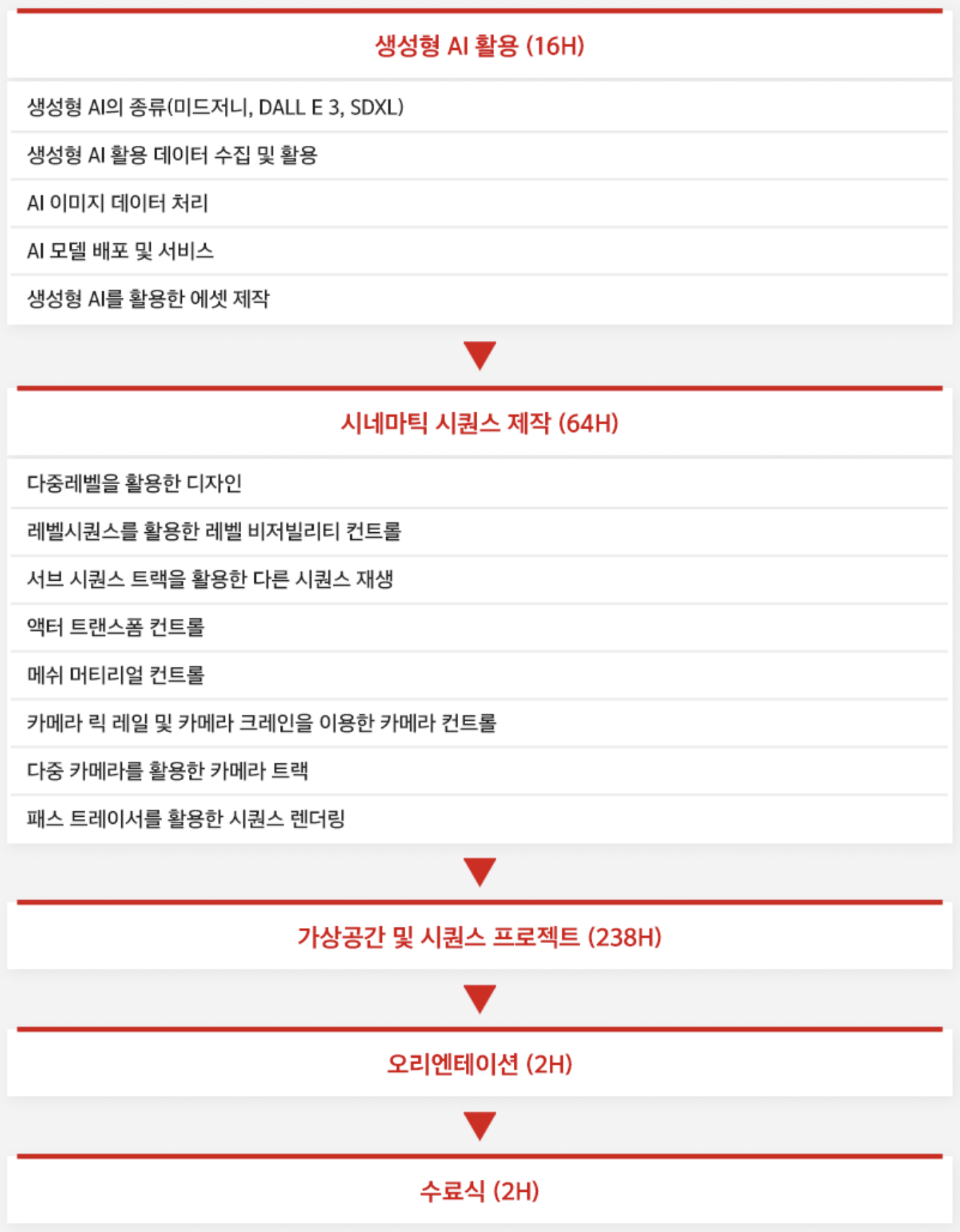 그리고 생성형 AI 활용 기술, 시네마틱 시퀀스 제작, 가상공간 및 시퀀스 프로젝트까지 이론과 실습을 통해 실제 업무에서 활용할 수 있는 스킬을 습득할 수 있습니다.