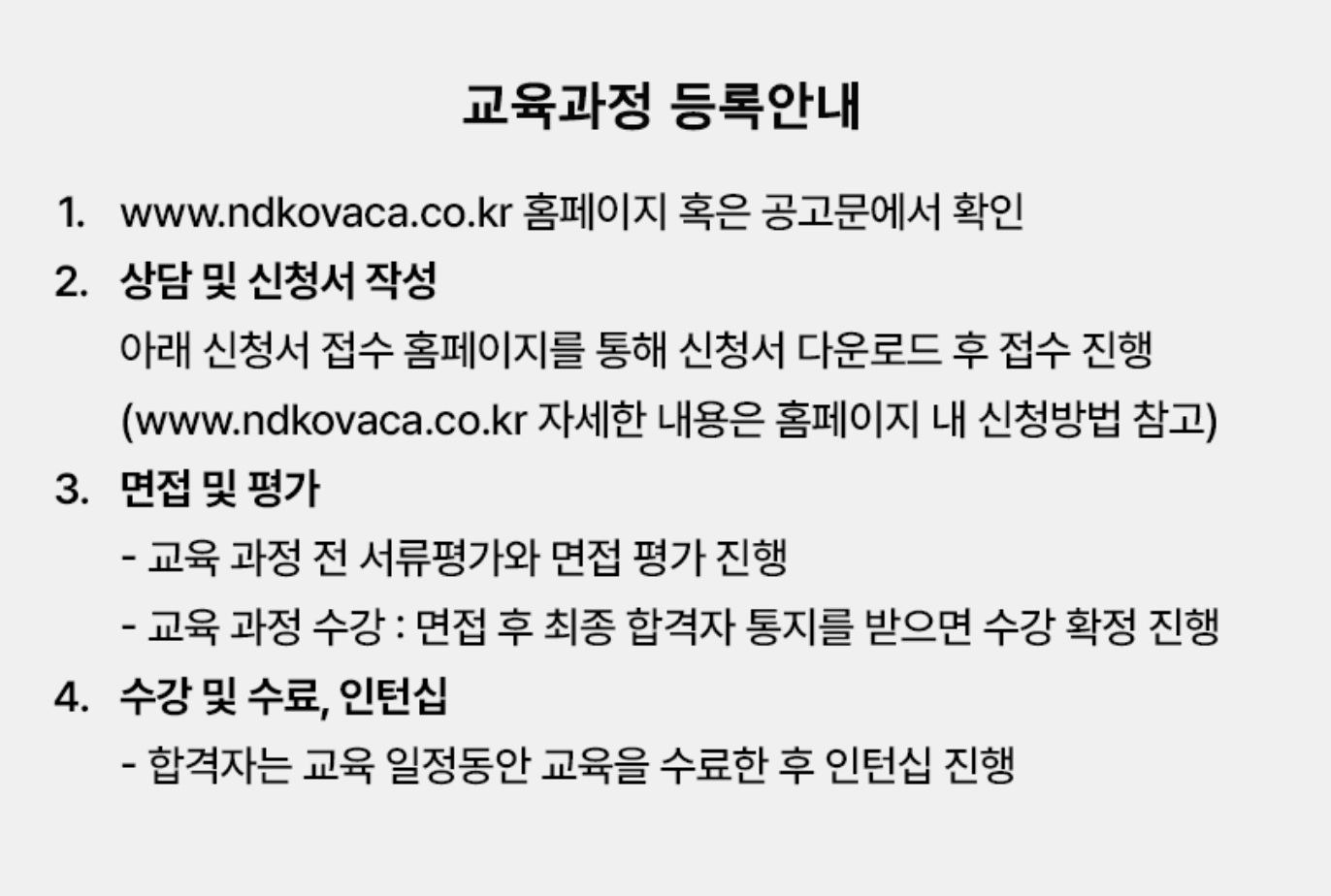 교육과정 등록안내는 https://www.ndkovaca.co.kr 홈페이지에서 확인 가능하고 사이트에서 신청 가능하니 들어가 보세요!