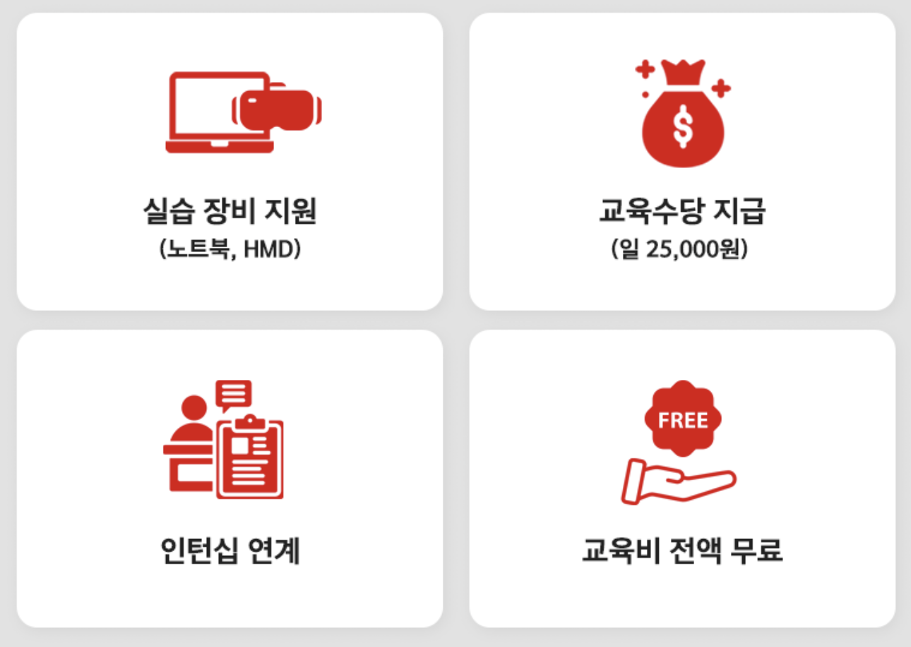 서울시 뉴딜일자리 사업 생성형 AI활용 언리얼 기반 XR콘텐츠 개발자 과정 모든 교육 과정에는 실습 장비 지원과 교육 수당 지급, 인턴십 연계까지 다 이뤄집니다. 그러니 별다른 준비는 필요하지 않습니다.