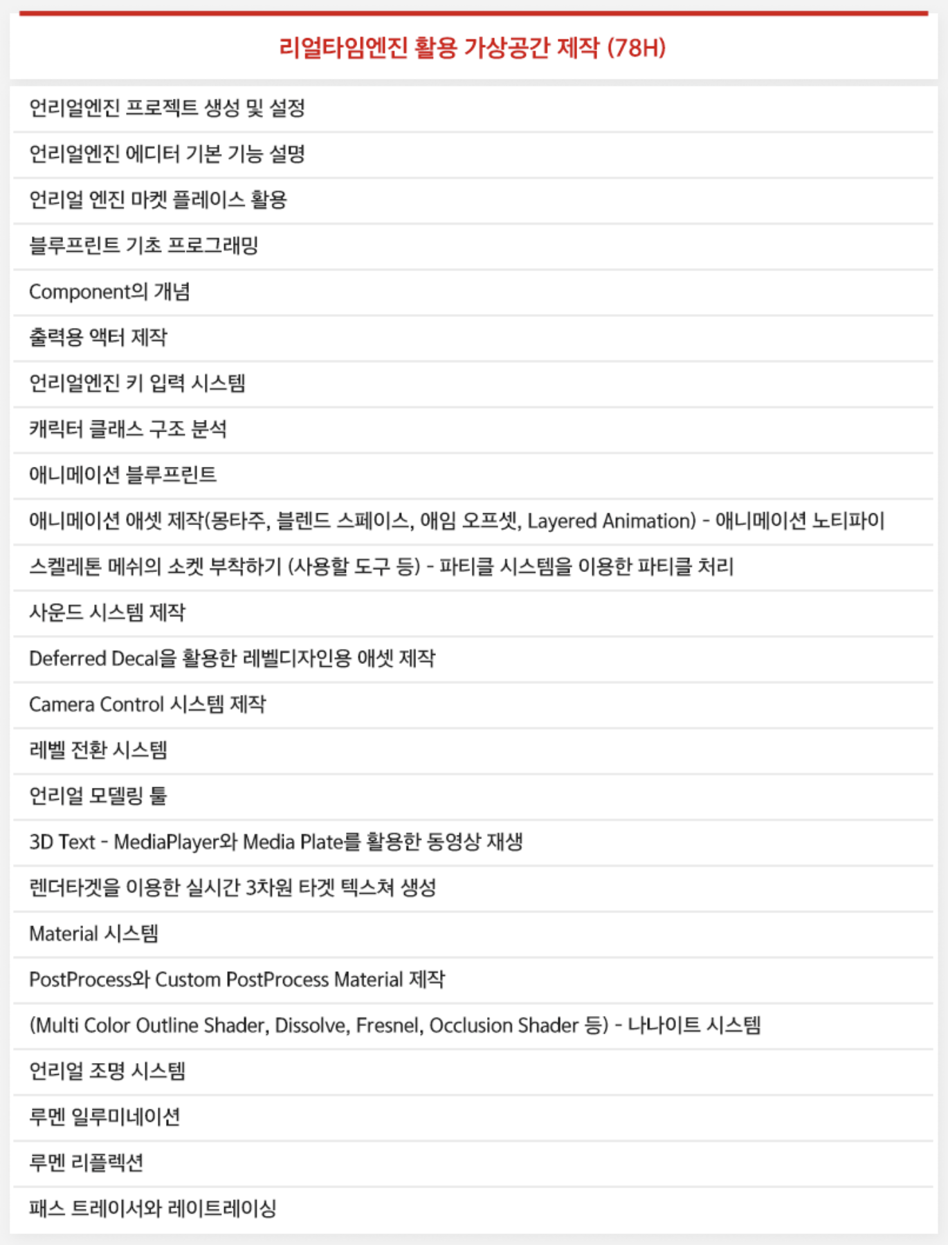 서울시 뉴딜일자리 사업 생성형 AI활용 언리얼 기반 XR콘텐츠 개발자 과정은 전문 게임 개발자 학원에서 진행되는 프로그램인만큼 체계적인 교육 커리큘럼이 준비되어 있습니다. 게임 개발에 필요한 전문 내용들을 차근차근 진행됩니다.