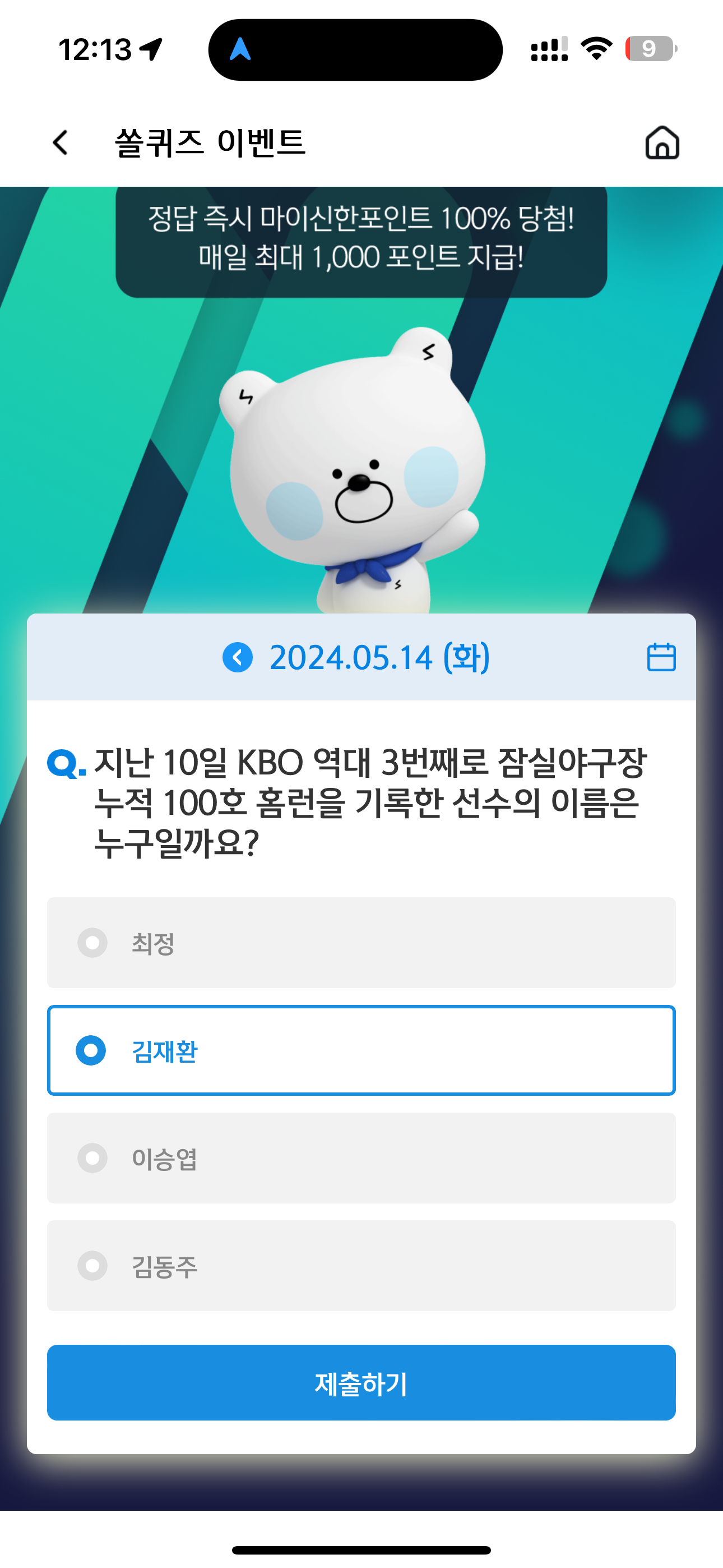 신한 슈퍼SOL 야구/상식 쏠퀴즈 정답은 김재환 입니다