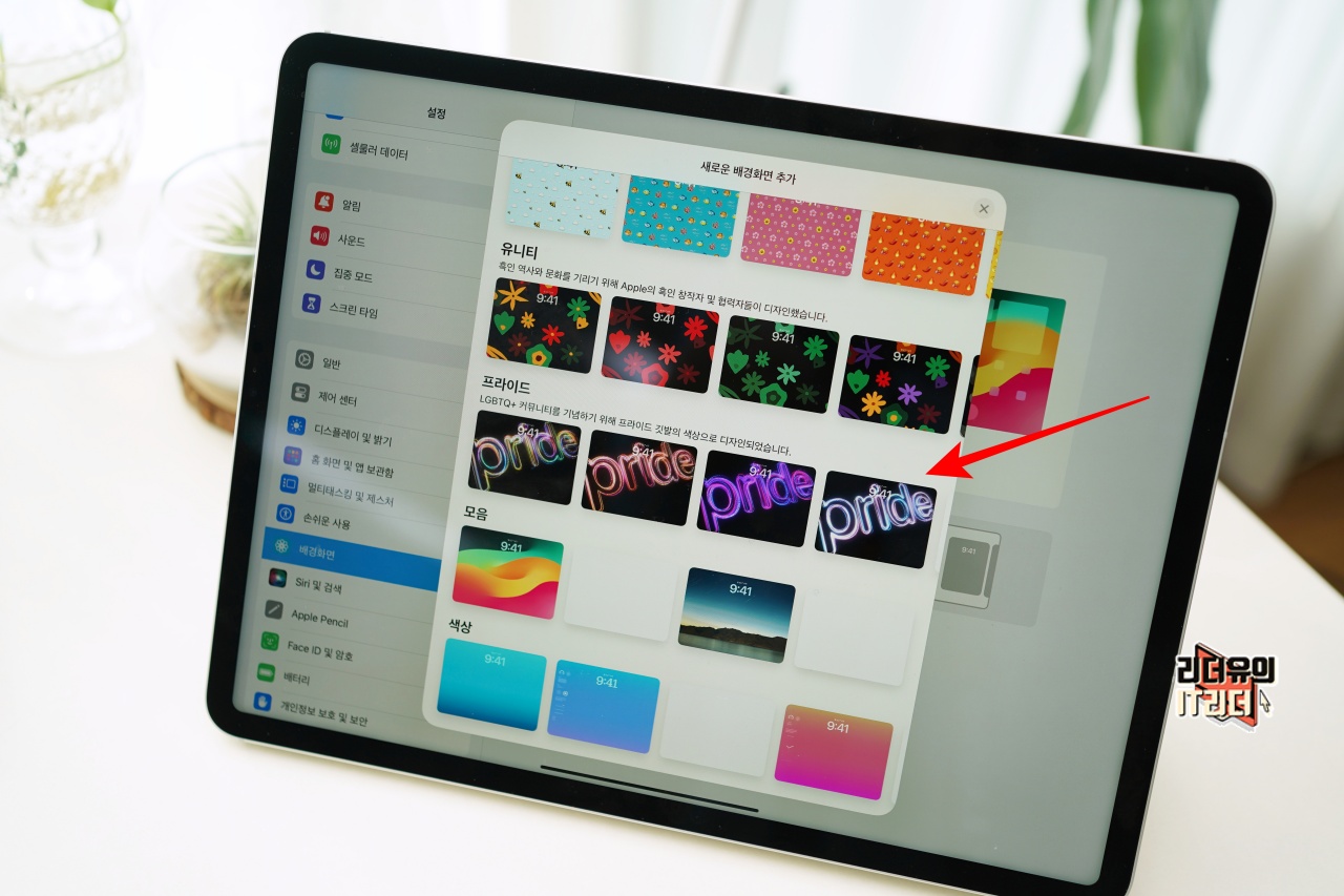 아이패드 iPadOS 17.5 업데이트 후 설정 - 배경화면에 들어가면 프라이드 배경화면에 새롭게 추가된 걸 볼 수 있습니다.