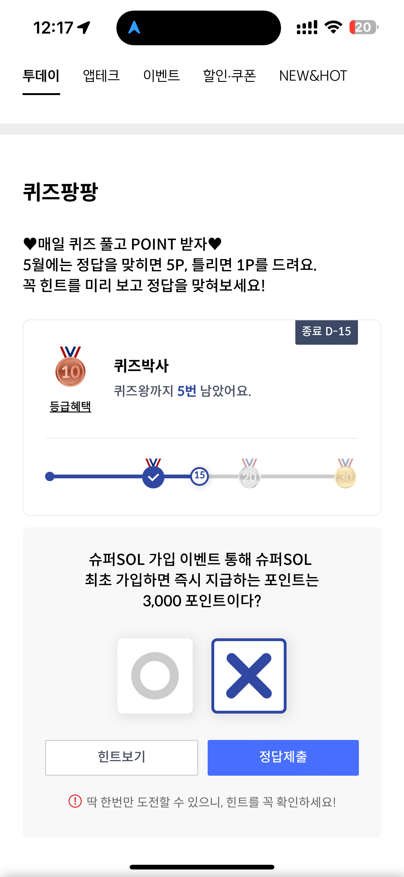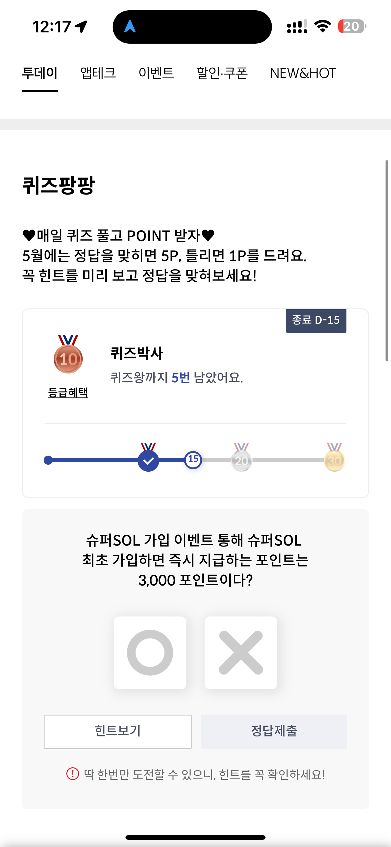 슈퍼SOL 가입 이벤트를 통해 슈퍼SOL 최초 가입하면 즉시 지급하는 포인트는 3,000 포인트이다? O, X 퀴즈인데요. 아직까지 슈퍼SOL 가입 안하신 분들은 좋은 기회네요. 가입만 하면 바로 지급이 되니 정말 좋겠죠. 주변에 슈퍼SOL 가입 안한 분이 있다면 알려주세요