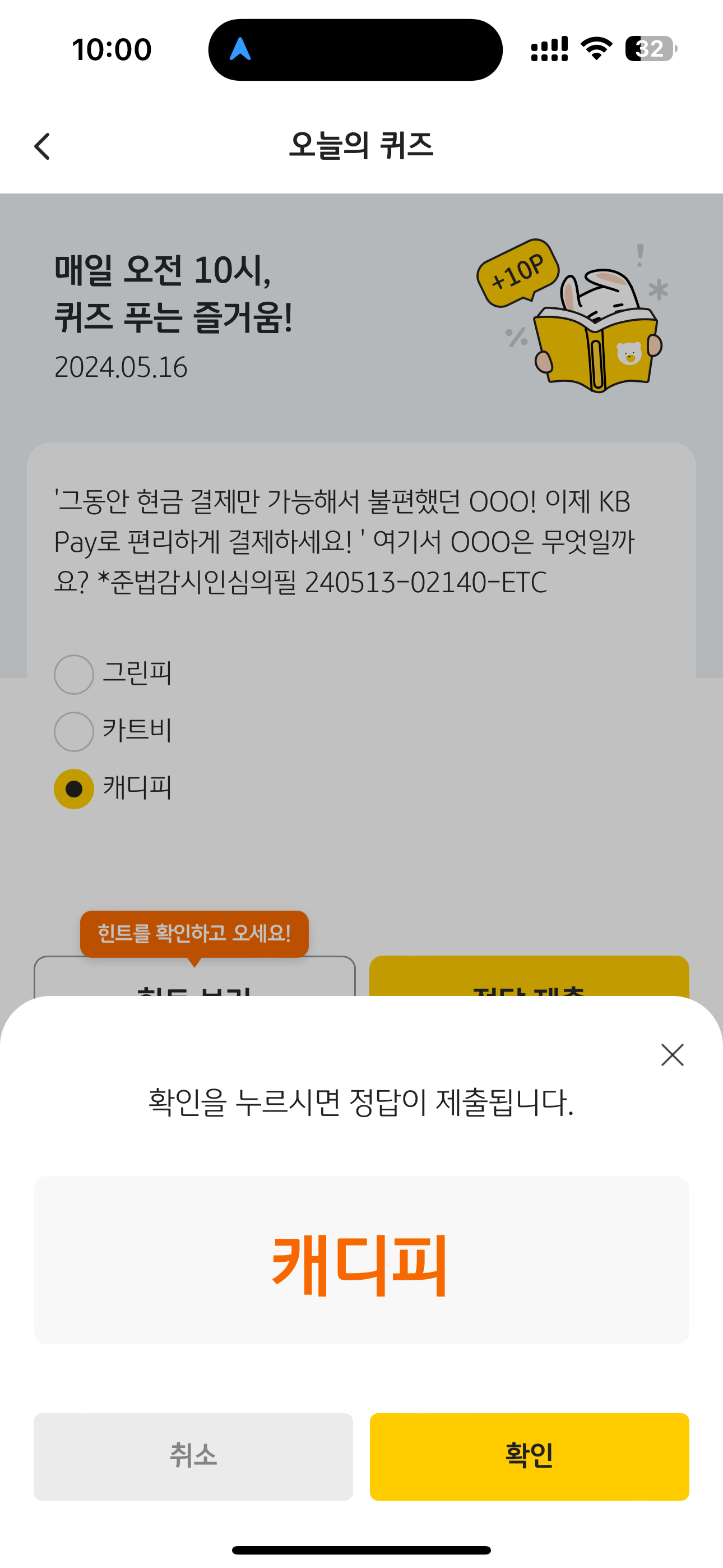 KB Pay 오늘의 퀴즈 정답은 캐디피 입니다