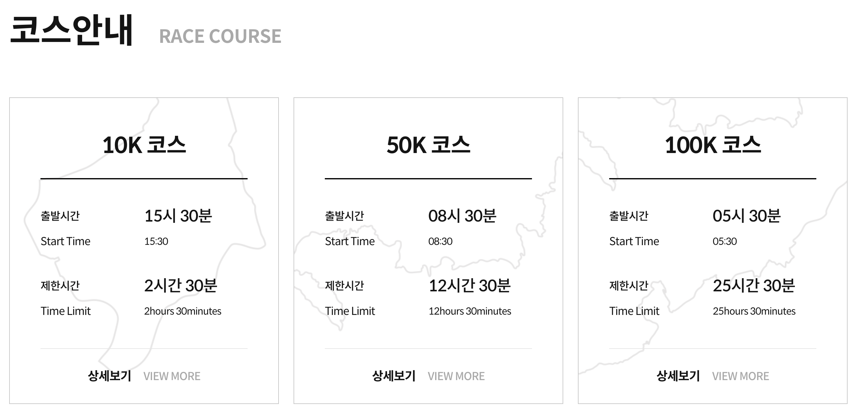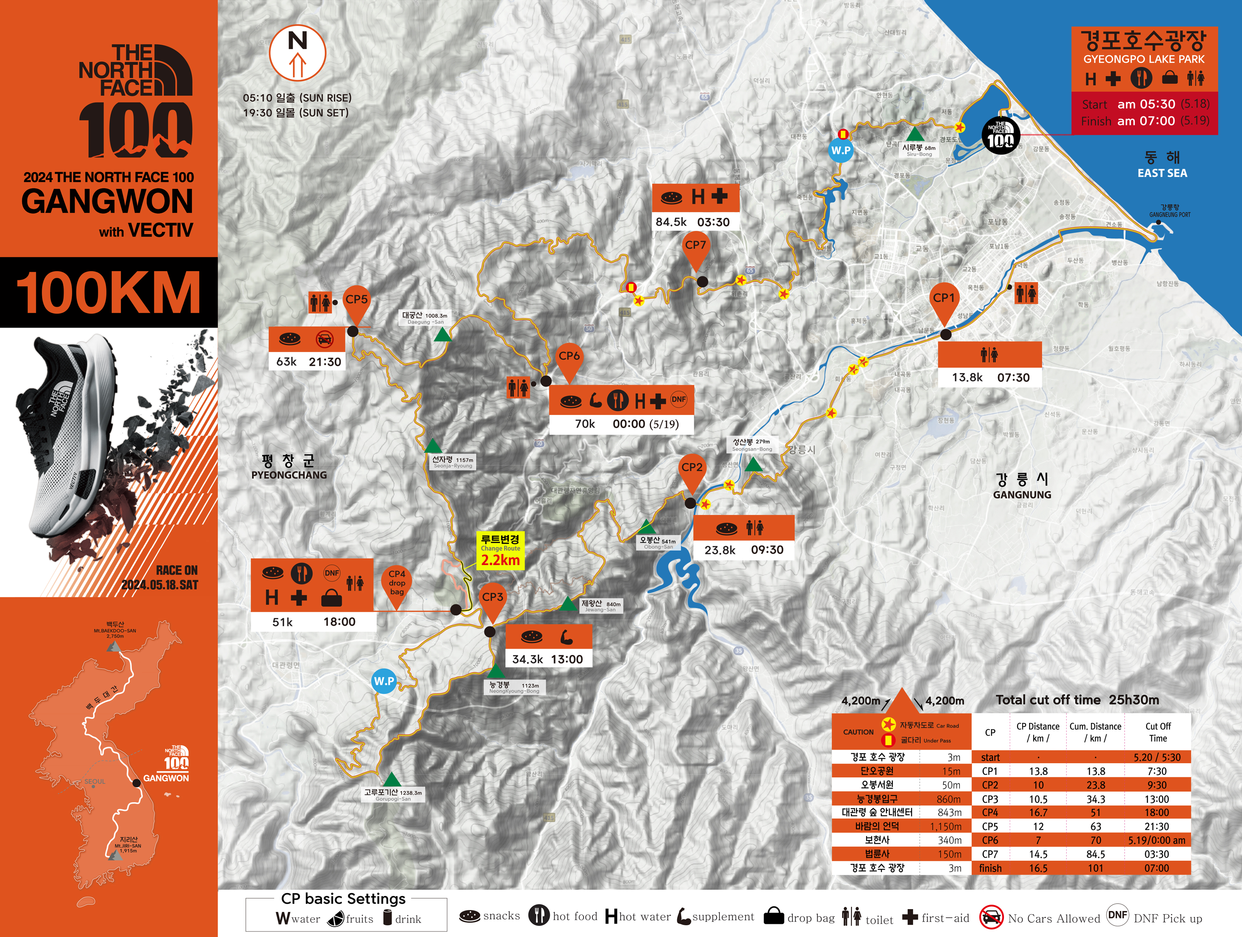 2024년 TNF100 제한시간은 100K 는 25시간 30분, 50K는 12시간 30분, 10K 는 2시간 30분 입니다. 중간 중간 CP별 제한시간도 있기 때문에 중간에 떨어지지 않게 속도 조절이 필요합니다.