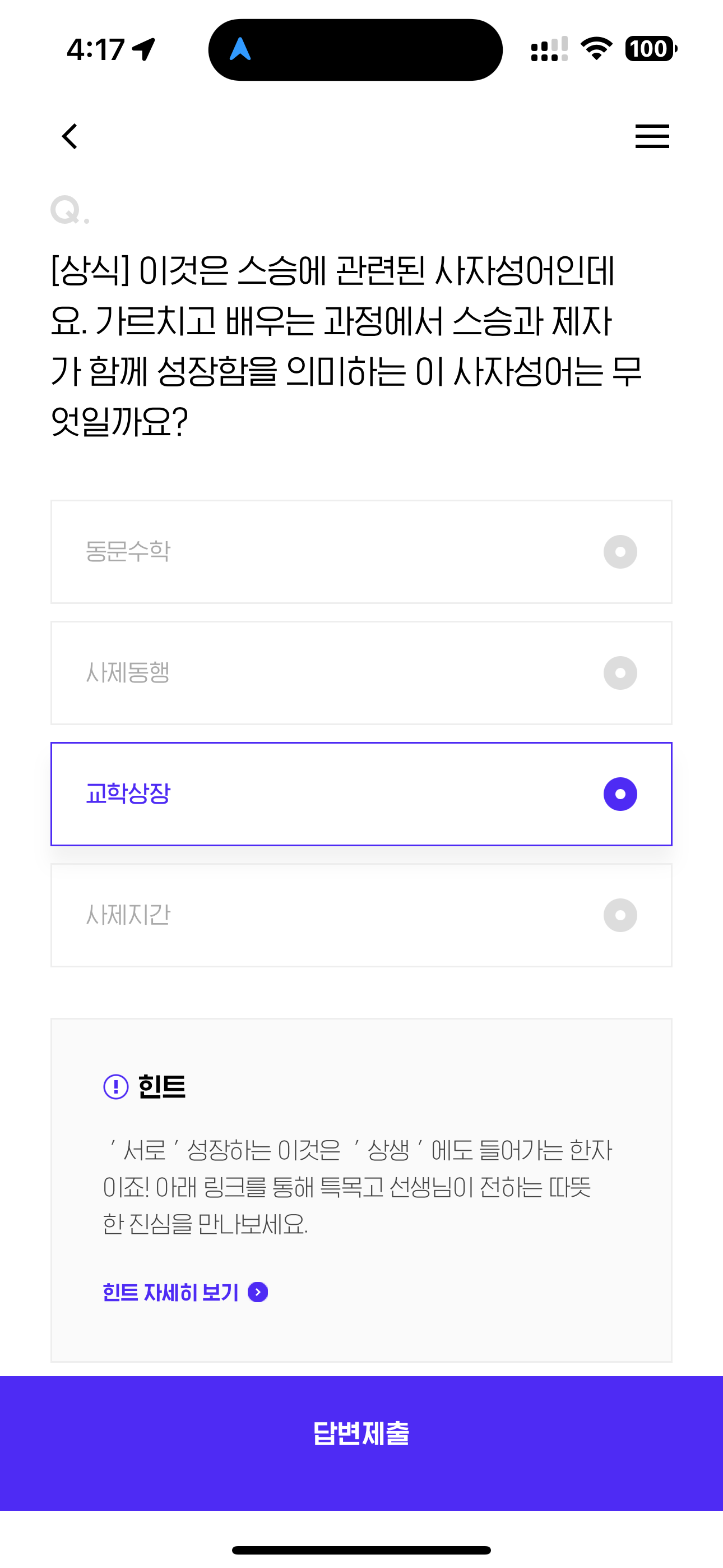 H포인트 퀴즈 정답은 교학상장 입니다