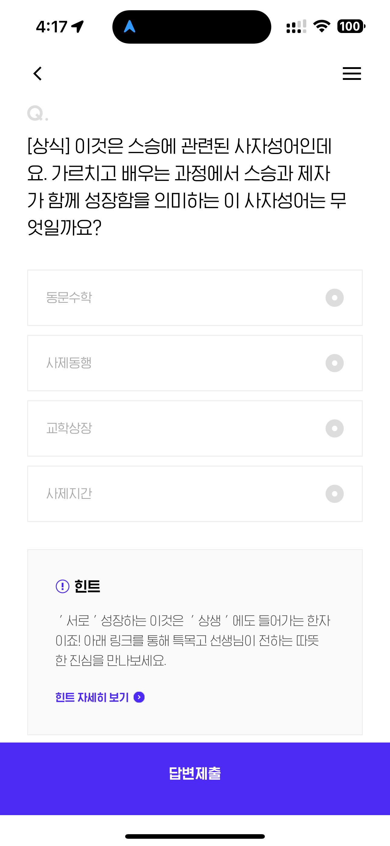 [상식] 이것은 스승에 관련된 사자성어인데요. 가르치고 배우는 과정에서 스승과 제자가 함께 성장함을 의미하는 이 사자성어는 무엇일까요? 보기는 1. 동문수학 2. 사제동행 3. 교학상장 4. 사제지간 입니다