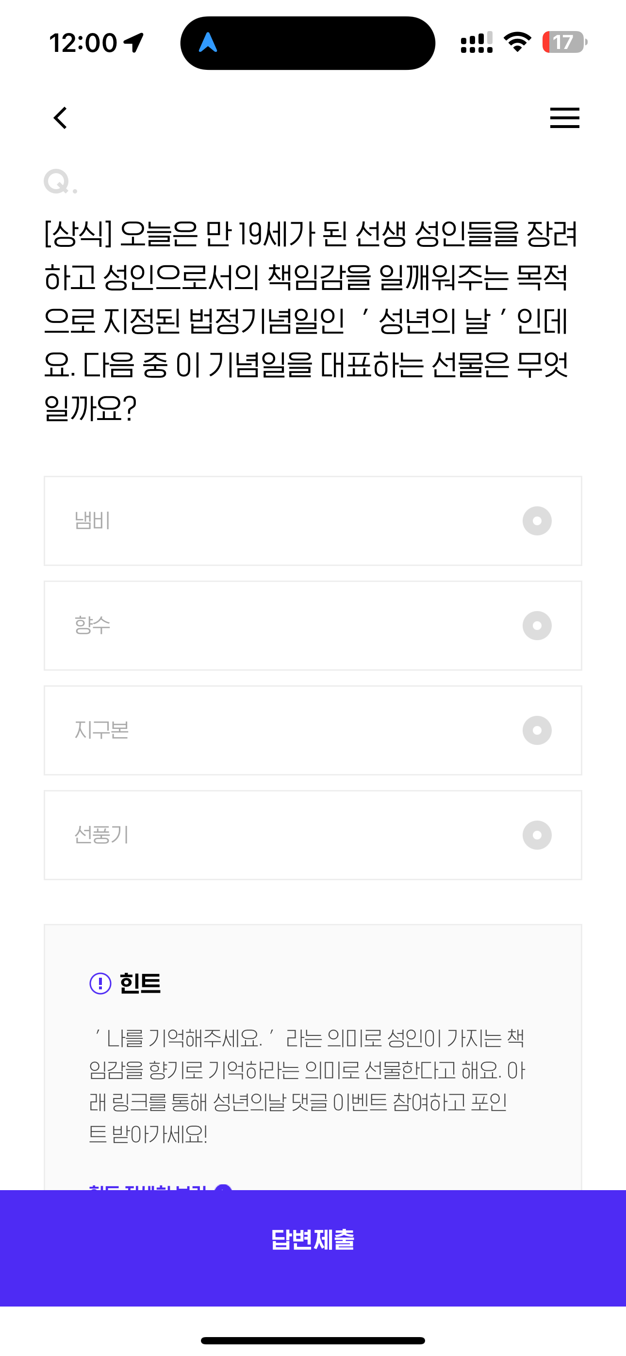[상식] 오늘은 만 19세가 된 선생 성인들을 장려하고 성인으로서의 책임감을 일깨워주는 목적으로 지정된 법정기념일인 ' 성년의 날 ' 인데요. 다음 중 이 기념을 대표하는 선물은 무엇일까요? 보기는 1. 냄비 2. 향수 3. 지구본 4. 선풍기 입니다. 성년의 날하면 생각나는 선물은 안보여서 당황스러워 하겠지만 쉽게 힌트가 있습니다.