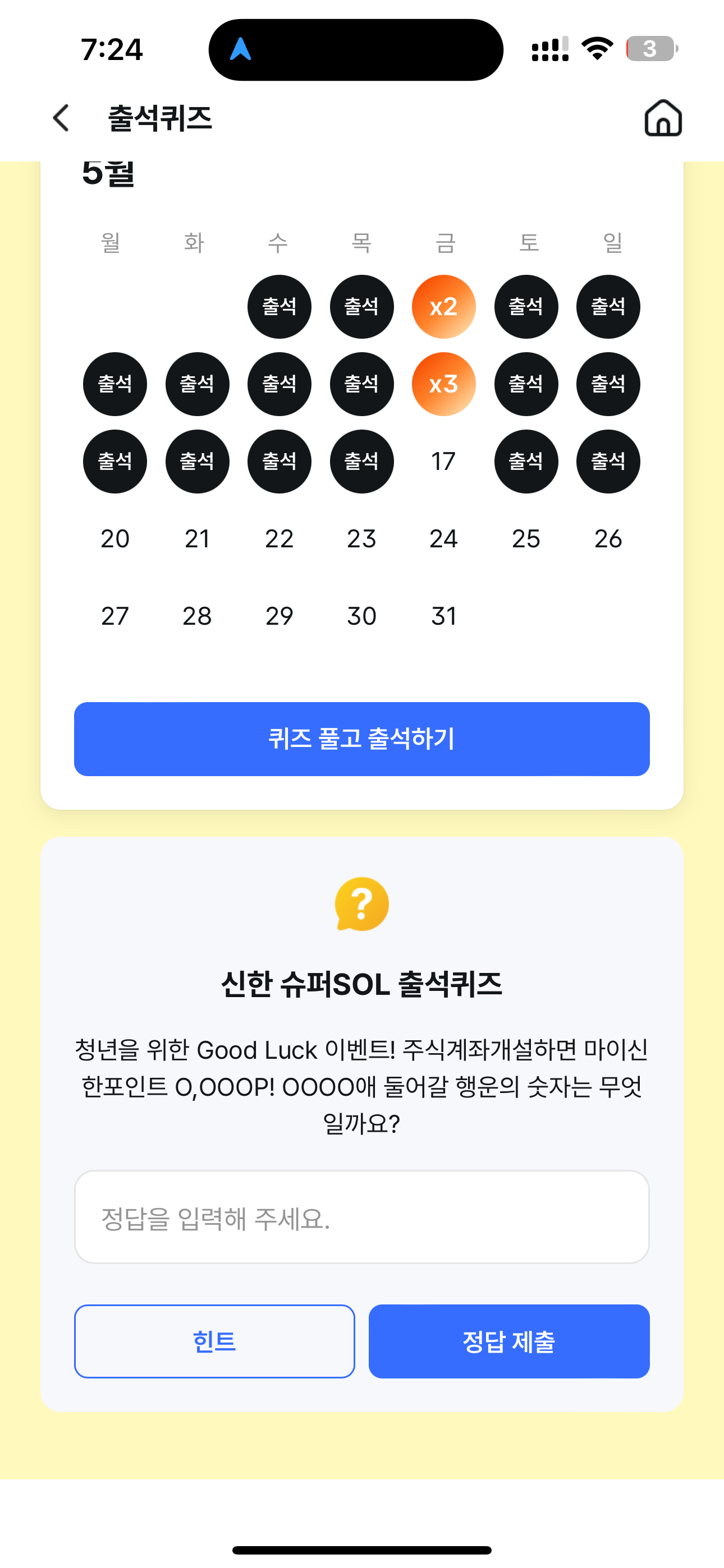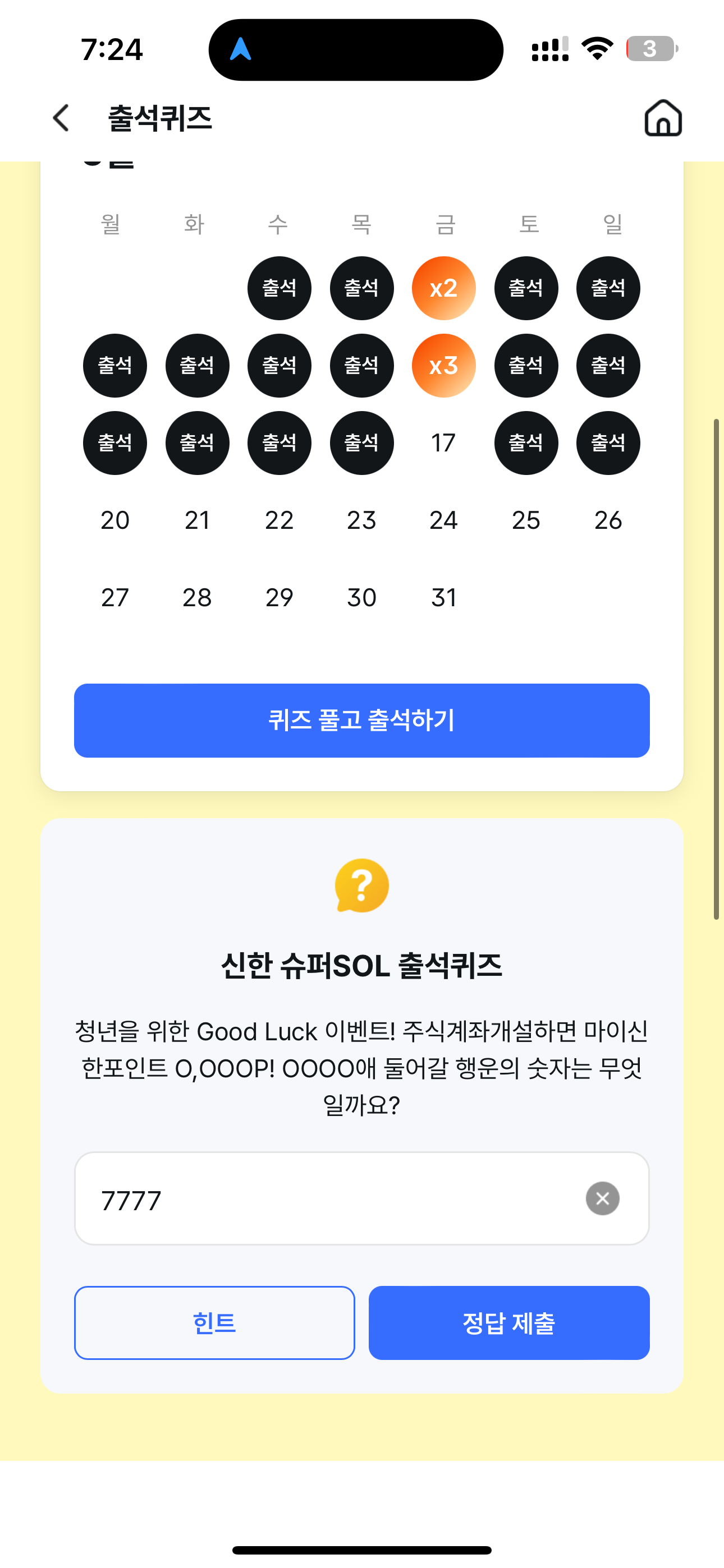 신한 슈퍼SOL 출석퀴즈 정답은 7777 입니다