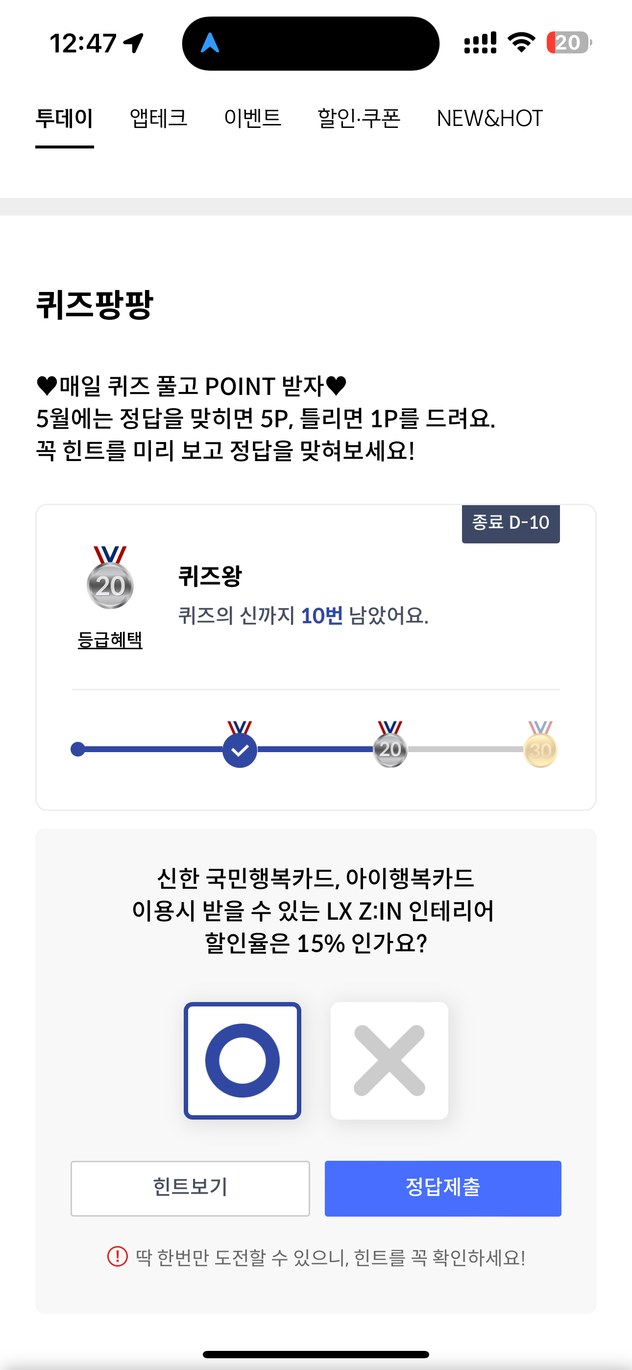 신한카드 퀴즈팡팡 5월 21일 정답(신한 국민행복카드, 아이행복카드 이용시 받을 수 있는 LX Z:IN 인테리어 할인율은 15% 인가요?)