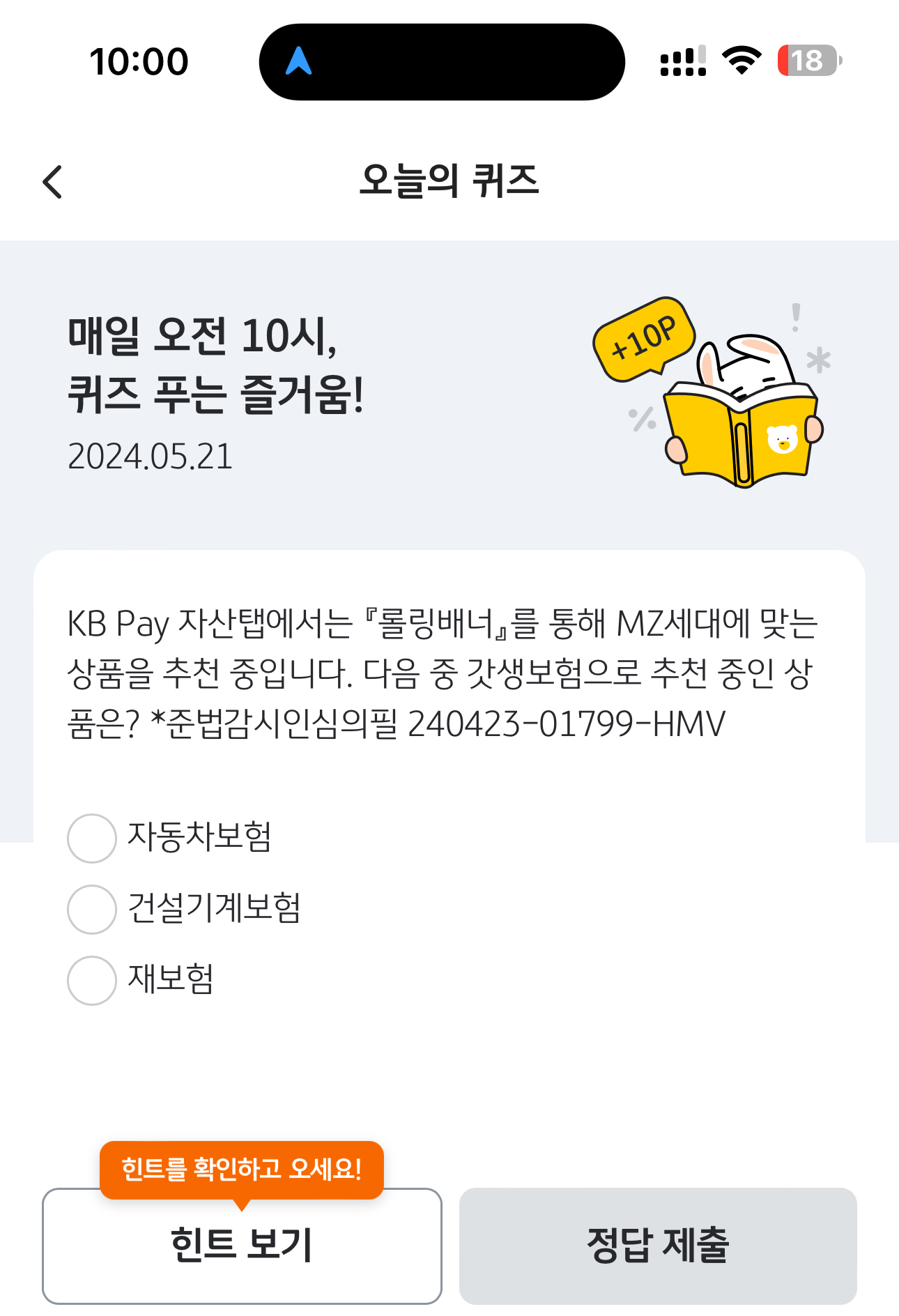 KB Pay 오늘의 퀴즈 정답은 자동차보험 입니다