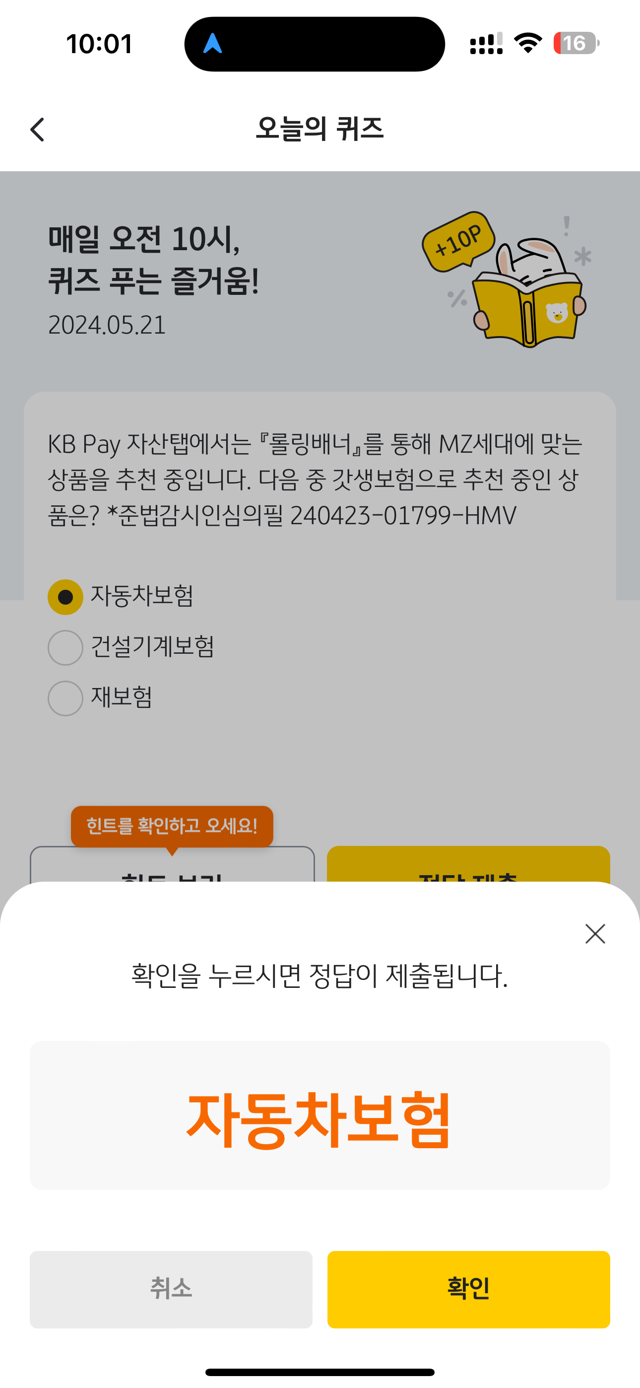KB Pay 오늘의 퀴즈 정답은 자동차보험 입니다