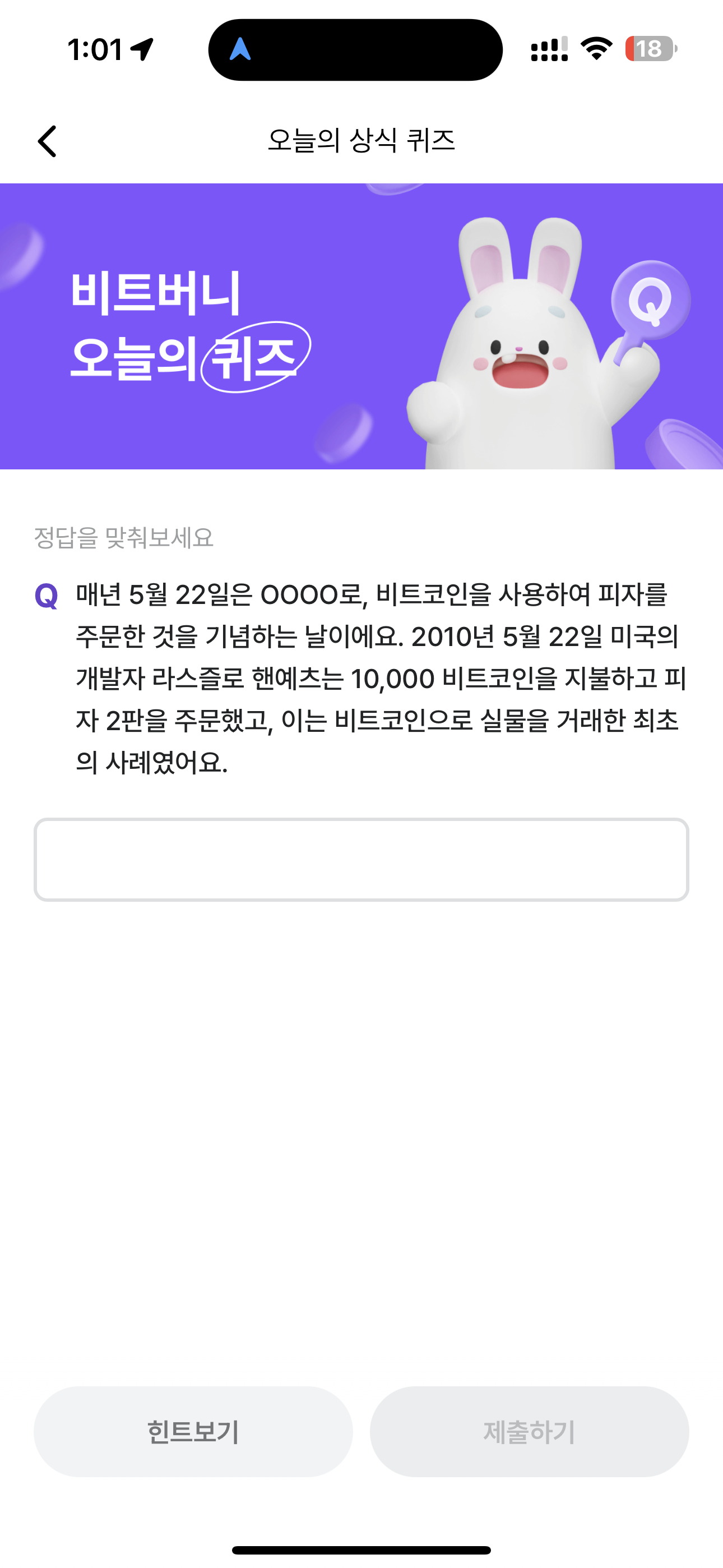매년 5월 22일은 OOOO로, 비트코인을 사용하여 피자를 주문한 것을 기념하는 날이에요. 2010년 5월 22일 미국의 개발자 라스즐로 핸예츠는 10,000 비트코인을 지불하고 피자 2판을 주문했고, 이는 비트코인으로 실물을 거래한 최초의 사례였어요. 주관식 퀴즈인데요.