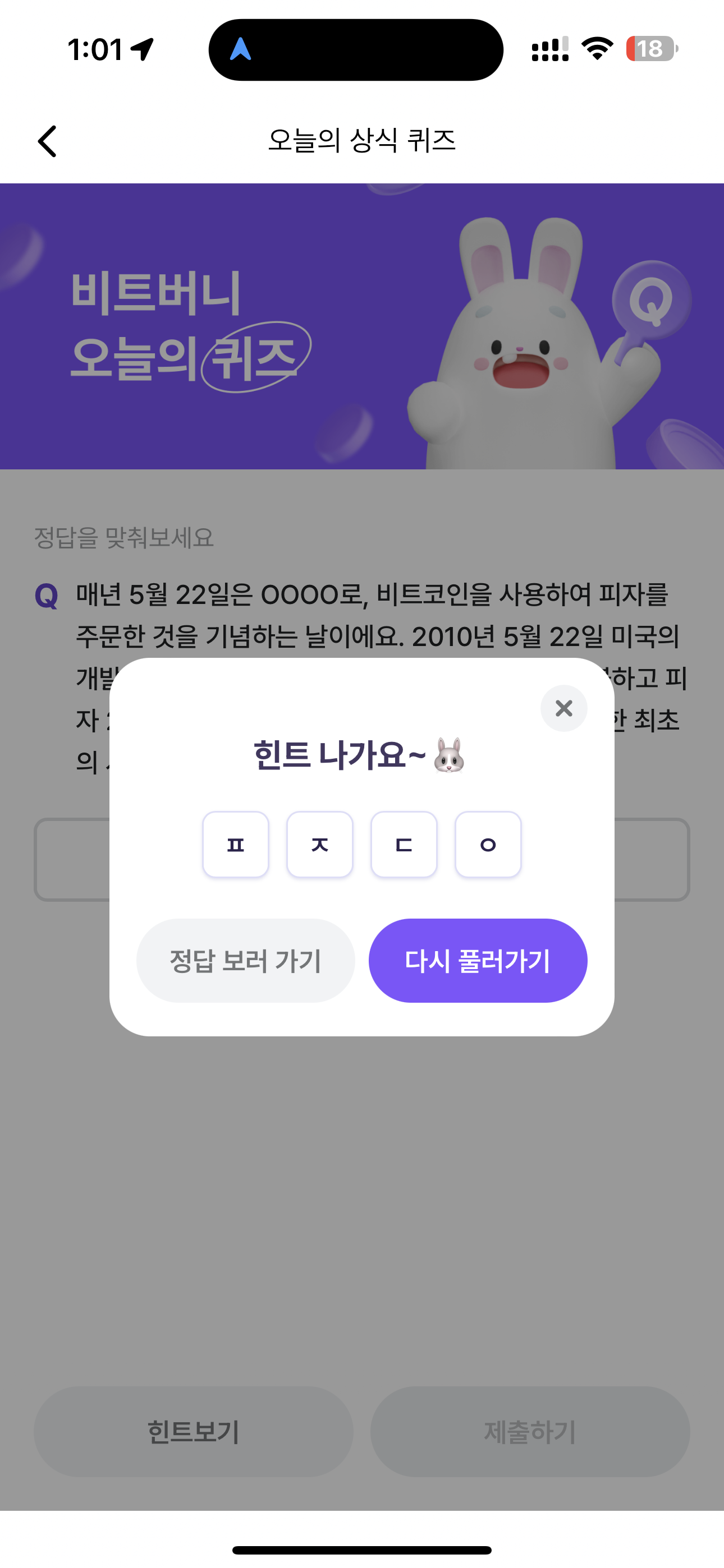 비트버니 오늘의 퀴즈 초성 힌트는 ㅍㅈㄷㅇ 입니다