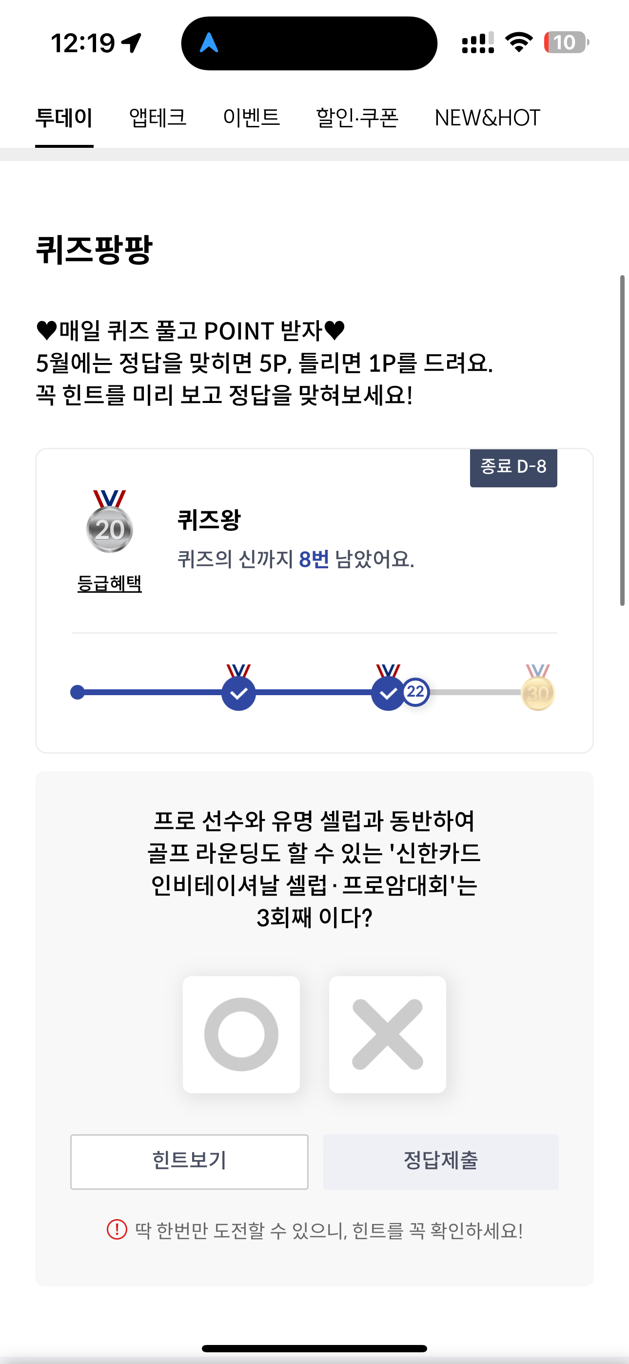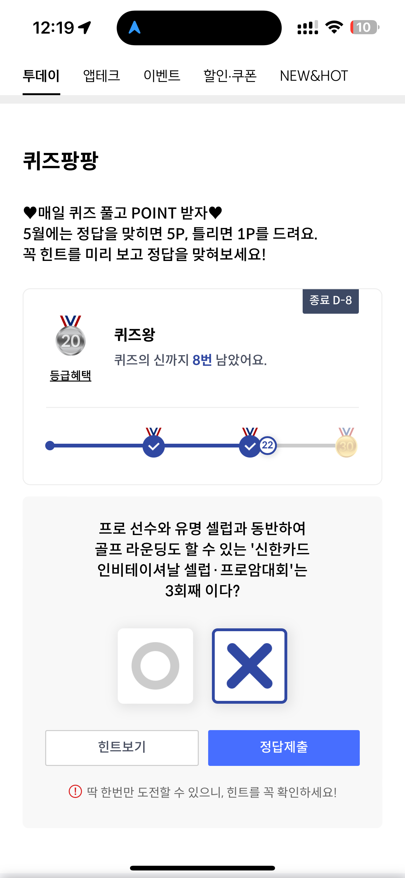 신한카드 퀴즈팡팡 정답은 X 입니다