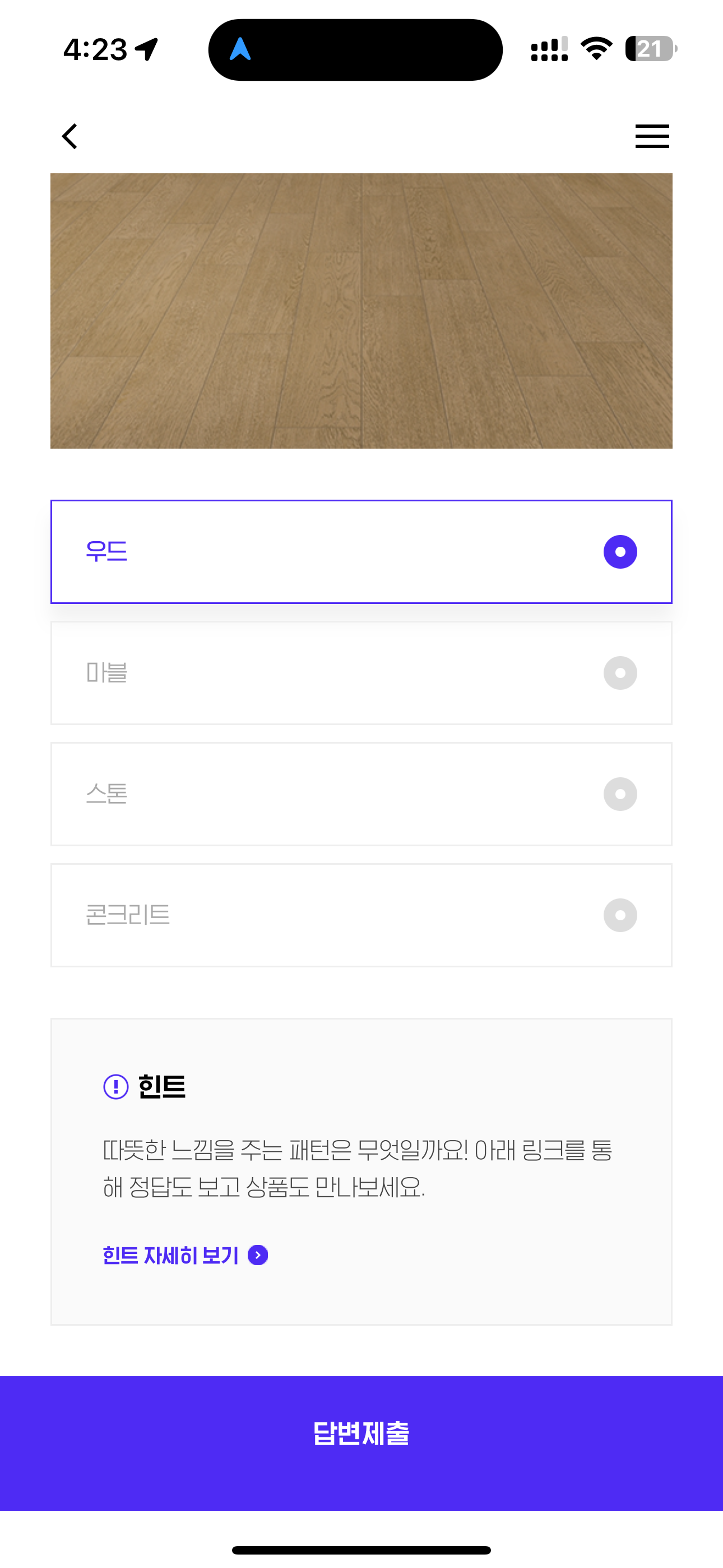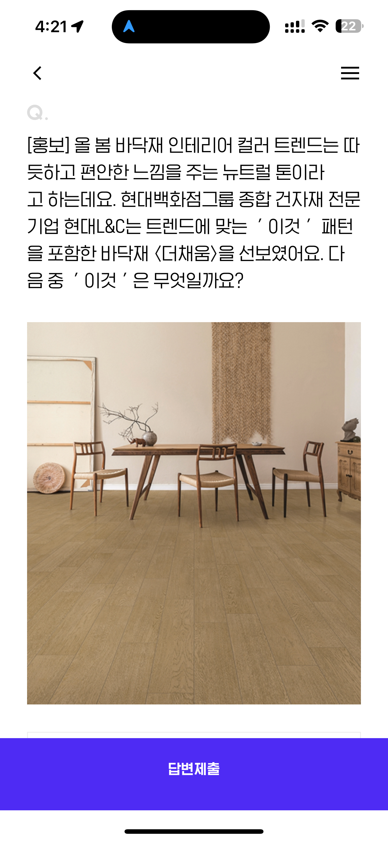 [홍보] 올 봄 바닥재 인테리어 컬러 트렌드는 따듯하고 편안한 느낌을 주는 뉴트럴 톤이라고 하는데요. 현대백화점그룹 종합 건자재 전문 기업 현대L&C는 트렌드에 맞는 ' 이것 ' 패턴을 포함한 바닥재 <더채움.을 선보였어요. 다음 중 ' 이것 ' 은 무엇일까요? 보기는 1. 우드 2. 마블 3. 스톤 4. 콘크리트 입니다