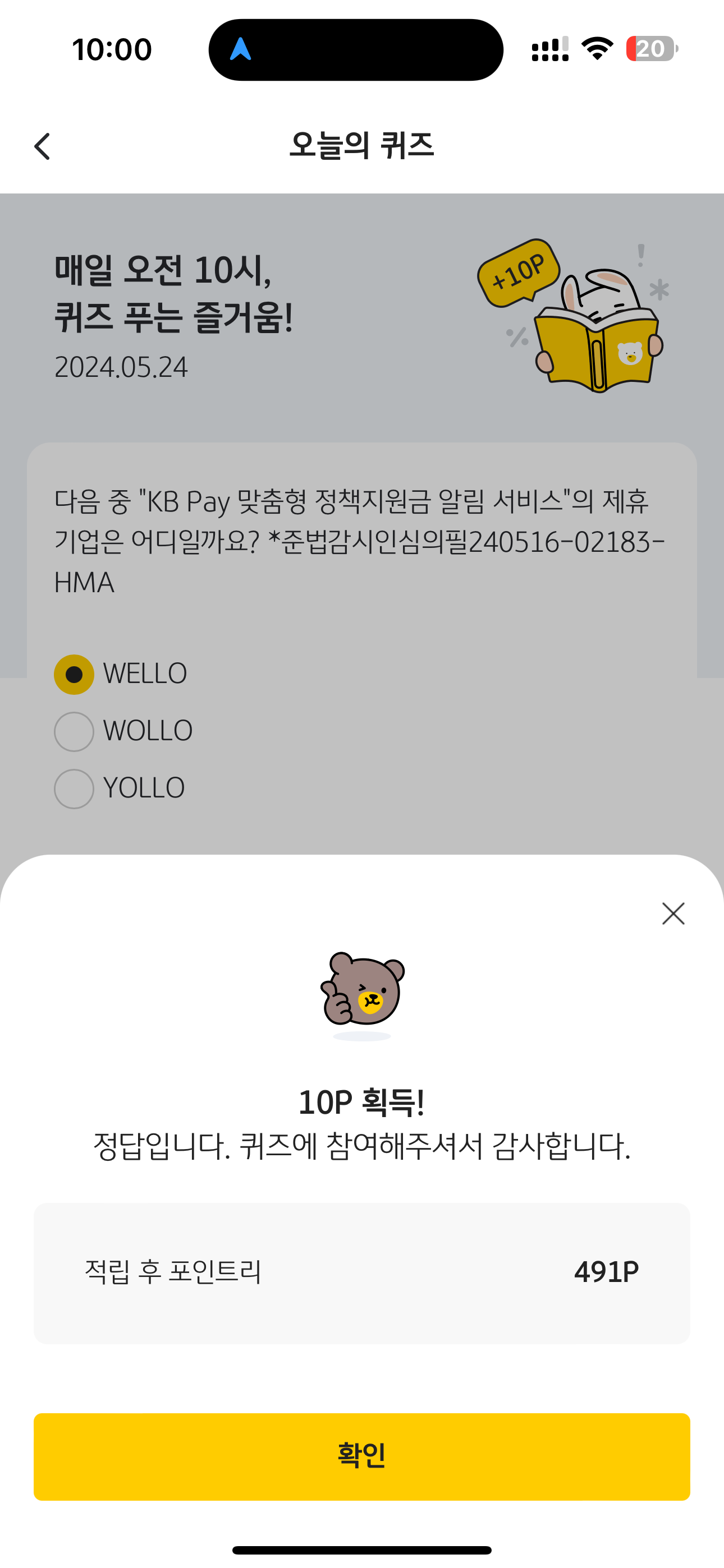 KB Pay 오늘의 퀴즈 정답은 WELLO 입니다