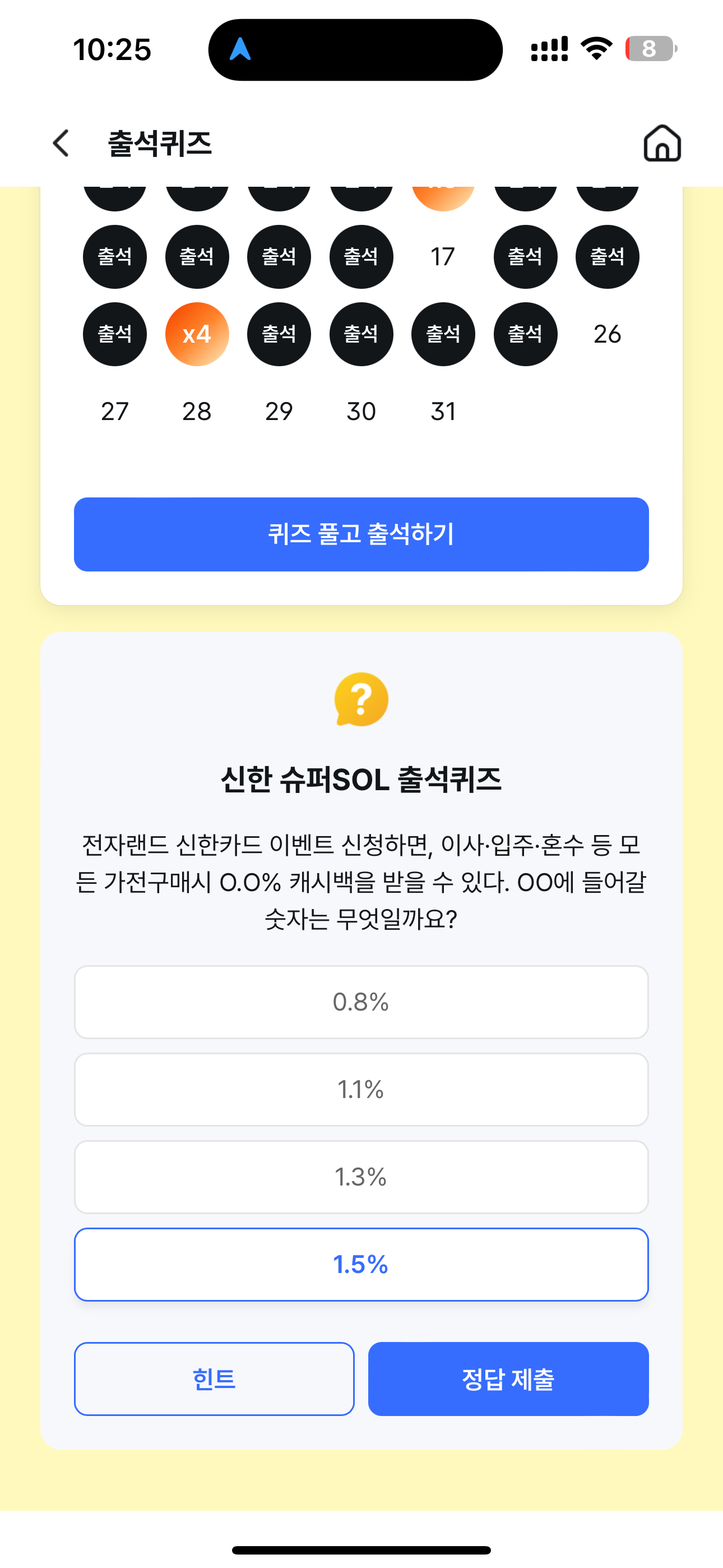 신한 슈퍼SOL 출석퀴즈 정답은 1.5% 입니다