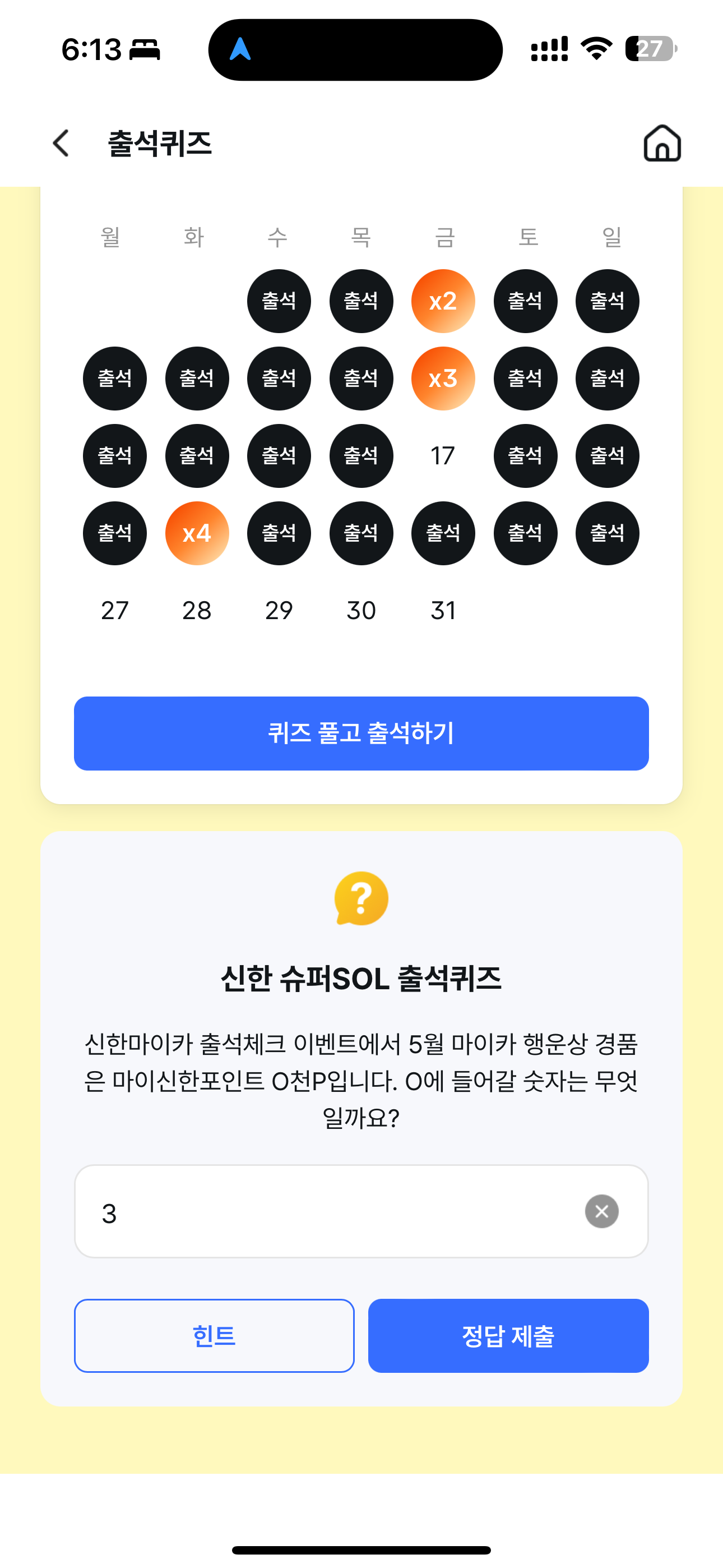 신한 슈퍼SOL 출석퀴즈 정답은 3 입니다