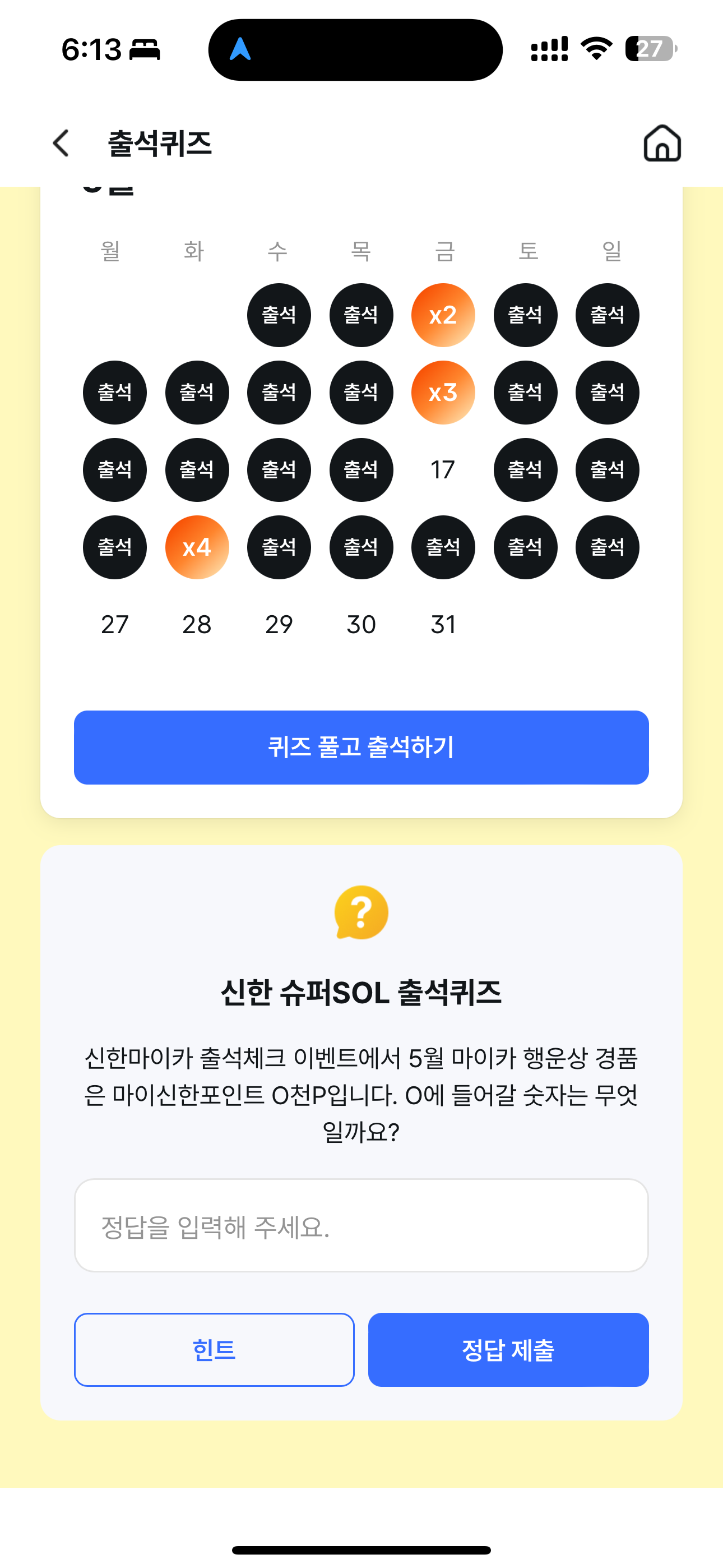 신한 슈퍼SOL 출석퀴즈 5월 27일 문제입니다