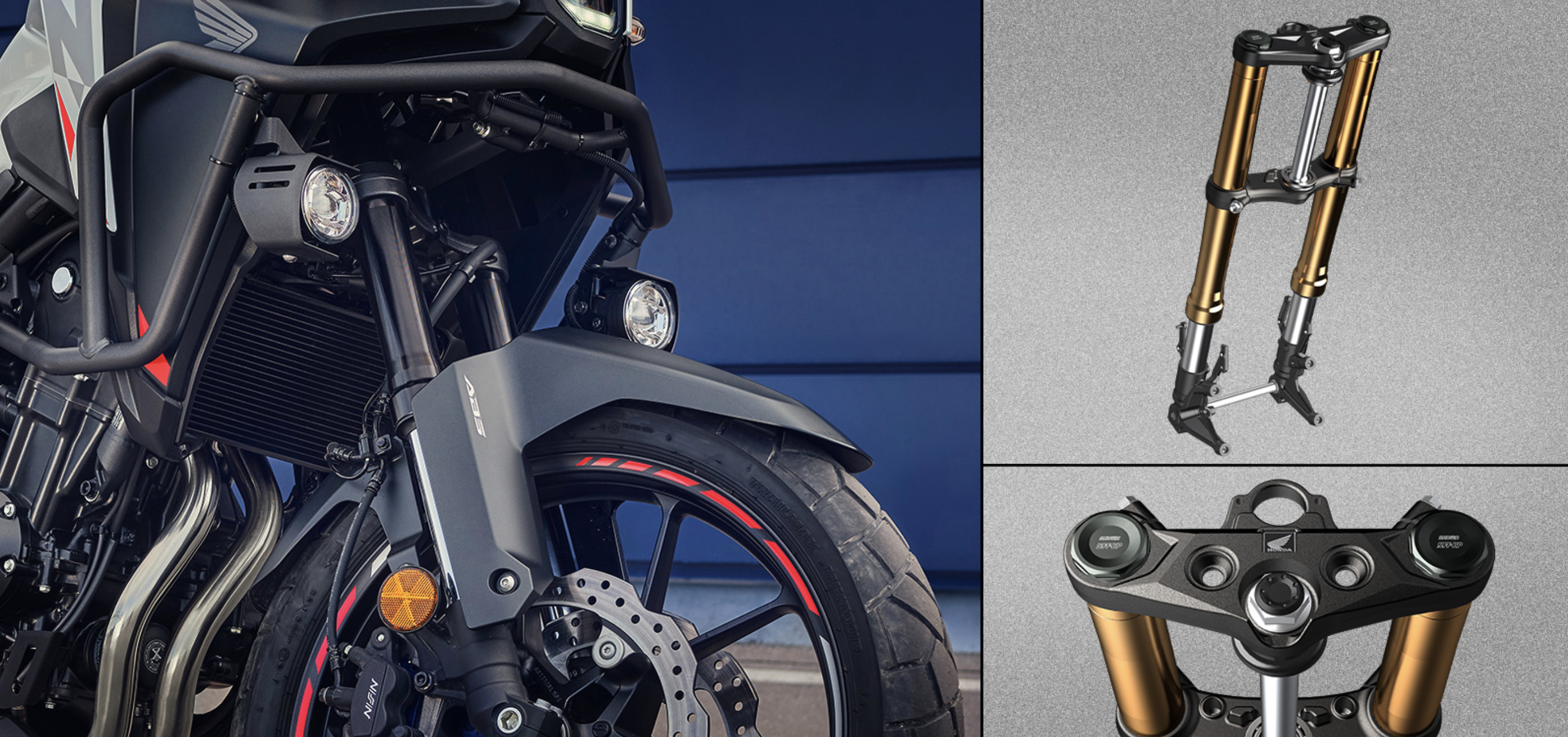 2024년 혼다 NX500은 오프로드 주행까지 고려하여 41mm SFF-BP 도립식 프런트 서스펜션을 채택했습니다. 거친 환경에서도 안전하게 탈 수 있게 준비되어 있습니다. 19인치 프런트 타이어를 장착해 고속 주행시에도 안전한 드라이빙이 가능합니다.