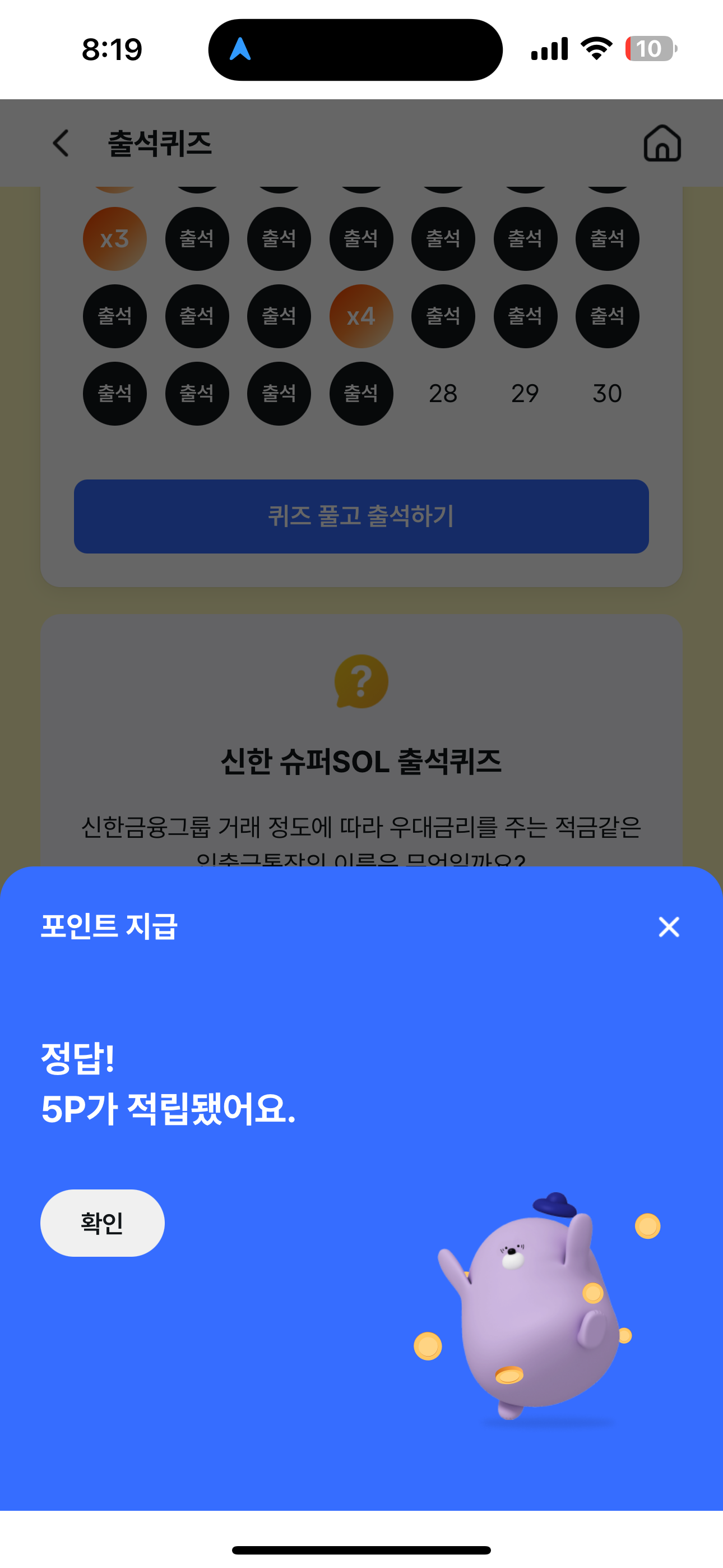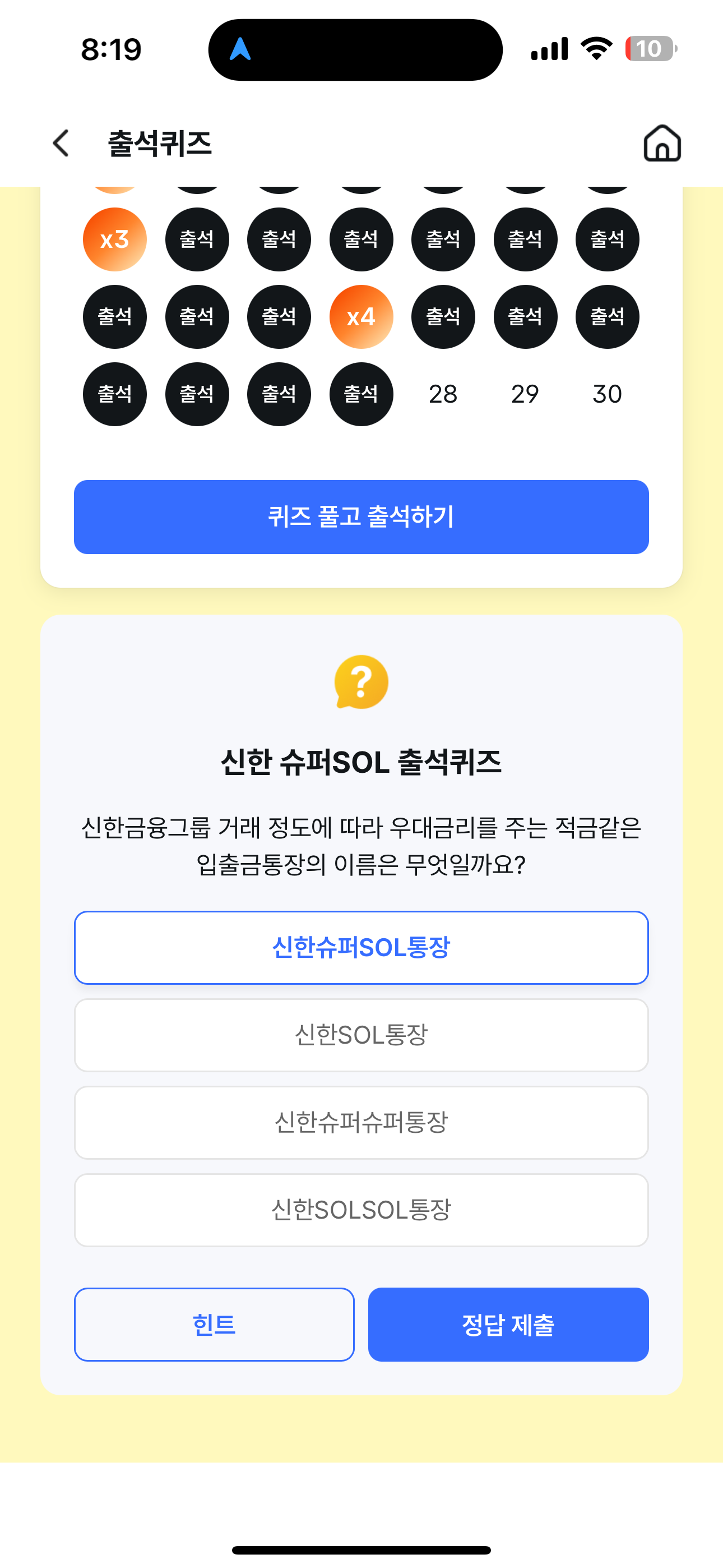 신한 슈퍼SOL 출석퀴즈 정답은 신한슈퍼SOL통장 입니다